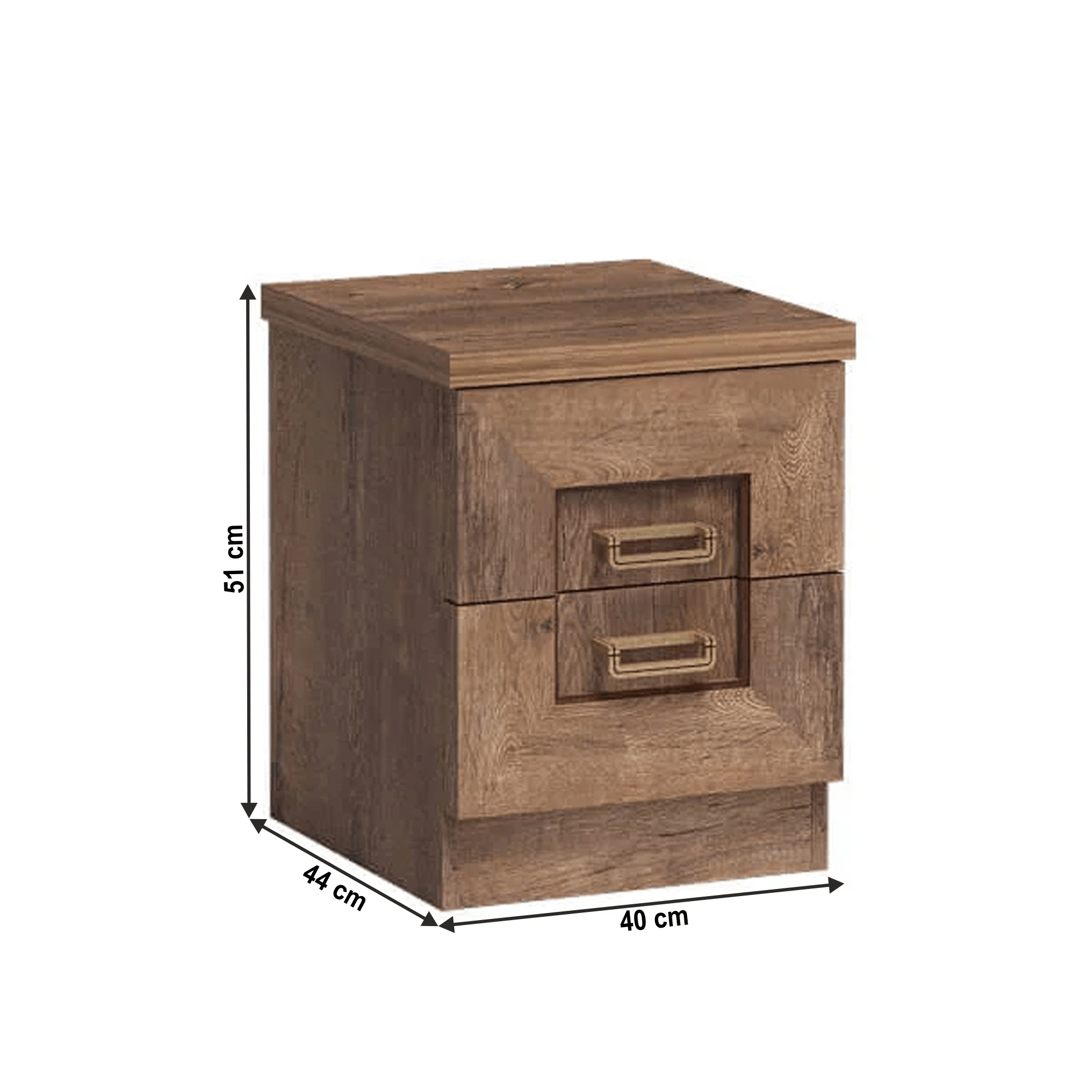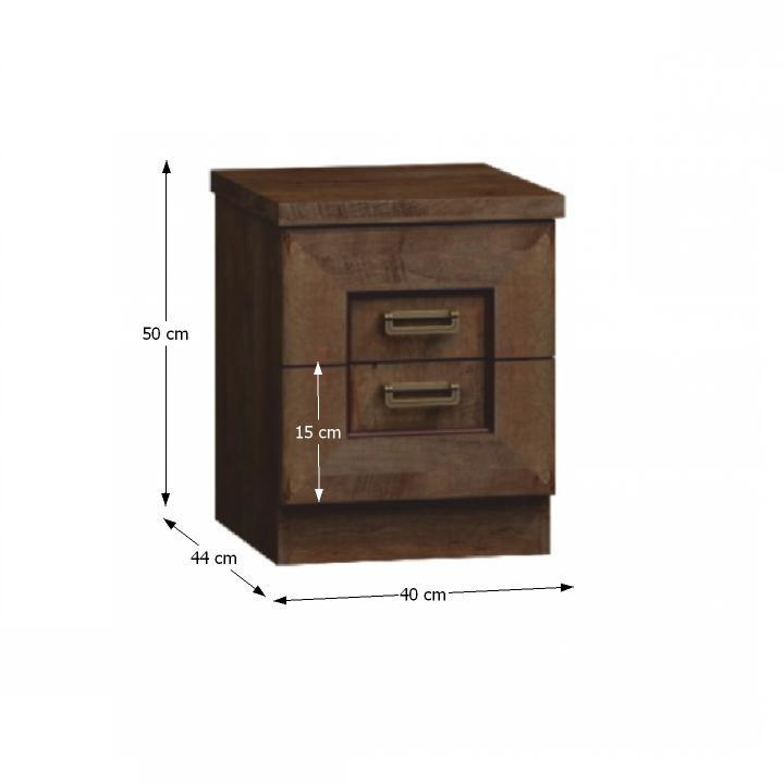 Noční stolek TEDY TYP T16 Materiál: laminovaná DTD/fóliovaná MDF/kov Barva: dub lefkas Rozměry (ŠxHxV): 40x44x50 cm Tloušťka materiálu: 32 mm Tloušťka materiálu zbývající části: 16 mm ABS hrany Rustikální styl Ozdobné lišty Kovové úchyty Dva šuplíky Dodáváno v demontu