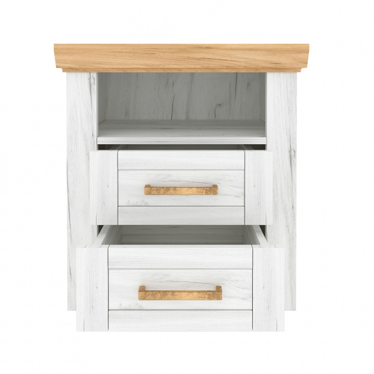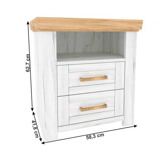Materiál: DTD laminovaná Barva: dub craft zlatý / dub craft bílý Rozměry (ŠxHxV): 58,3x41,8x62,7 cm Tloušťka materiálu korpus: 16 mm Tloušťka materiálu vrchní deska: 22 mm Výška spodního prostoru od podlahy je 4,2 cm dva šuplíky otevřený prostor Dodávané v demontu