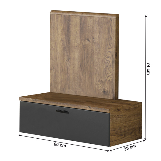 Noční stolek ARMENY 8XX3AT1P Materiál: DTD laminovaná Barva: dub ribeck/tmavý grafit Rozměry (ŠxHxV): 60x38x74 cm Tloušťka materiálu: 1,6 cm Pravé provedení Jeden šuplík Nosnost: 3 kg Nosnost šuplíku: 5 kg S úchytkami Materiál úchytek: kov Barva úchytek: černá Moderní design Dodáváno v demontu