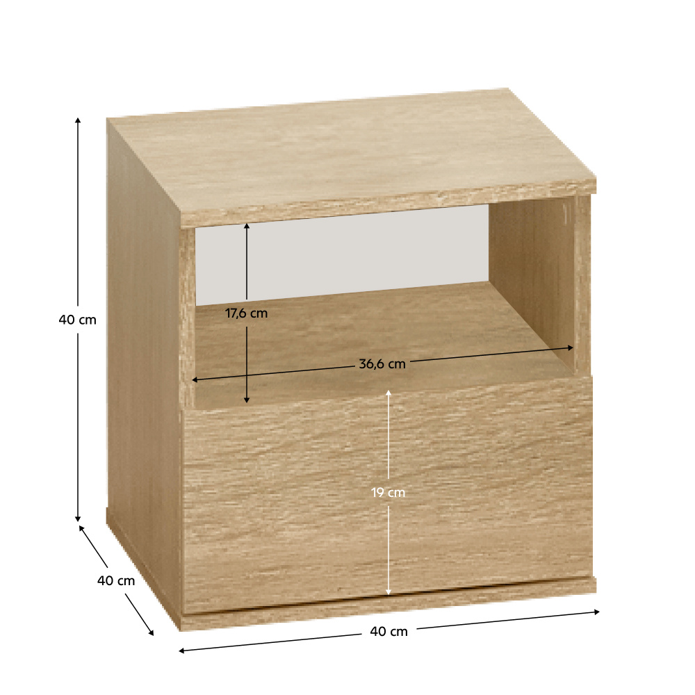 Materiál: laminovaná DTD Barva: dub sonoma Rozměry (ŠxHxV): 40x40x40 cm Tloušťka laminované DTD: 1,6 cm Šuplík Výška šuplíku: 19 cm Nosnost šuplíku: 5 kg Otevřená odkládací plocha Výška otevřené odkládací plochy: 17,6 cm Plastové nožičky-kluzáky Nosnost: 10 kg Bez úchytek Moderní design Kvalitní slovenský výrobek Dodáváno v demontu