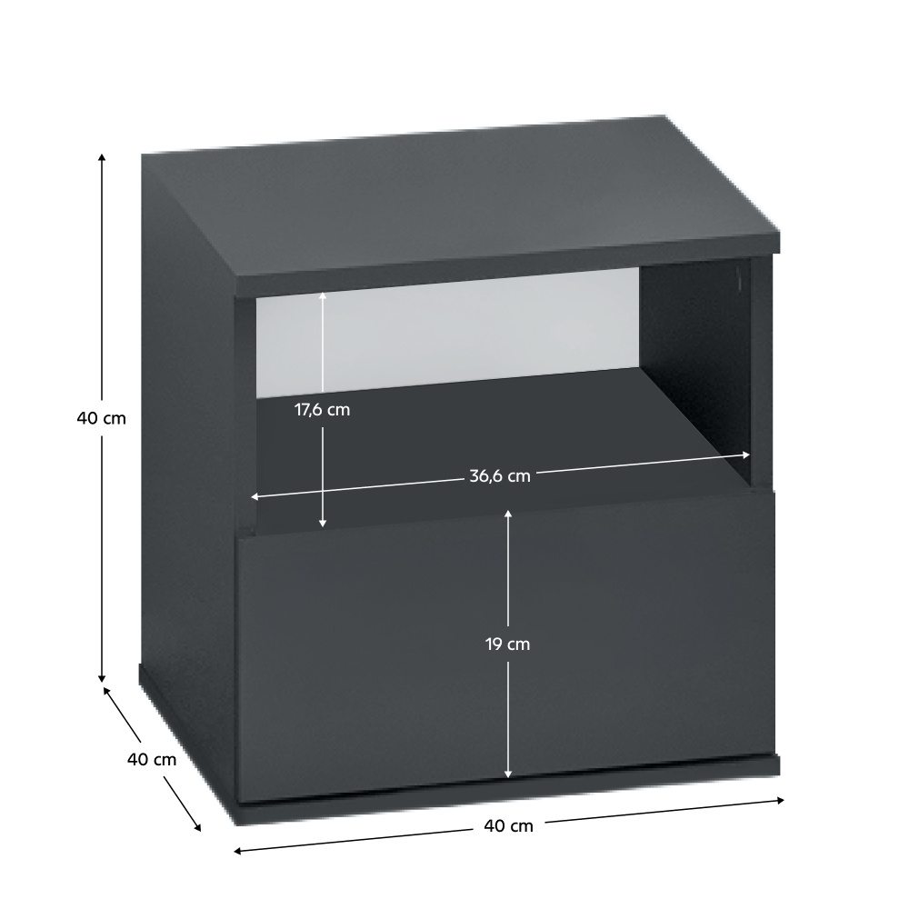 Materiál: laminovaná DTD Barva: grafit Rozměry (ŠxHxV): 40x40x40 cm Tloušťka laminované DTD: 1,6 cm Šuplík Výška šuplíku: 19 cm Nosnost šuplíku: 5 kg Otevřená odkládací plocha Výška otevřené odkládací plochy: 17,6 cm Plastové nožičky-kluzáky Nosnost: 10 kg Bez úchytek Moderní design Kvalitní slovenský výrobek Dodáváno v demontu