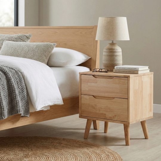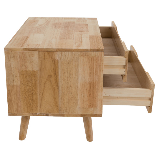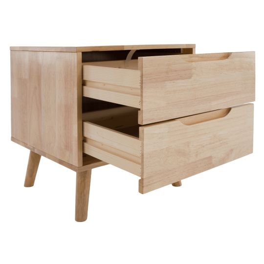 Materiál: kaučukové dřevo/borové dřevo Barva: přírodní Rozměry (ŠxHxV): 43x40,5x48 cm Výška stolku: 33 cm Dva šuplíky Na nožičkách Materiál nožiček: kaučuk Barva nožiček: přírodní Výška nožiček: 15 cm Zafrézované úchyty Dodáváno v demontu