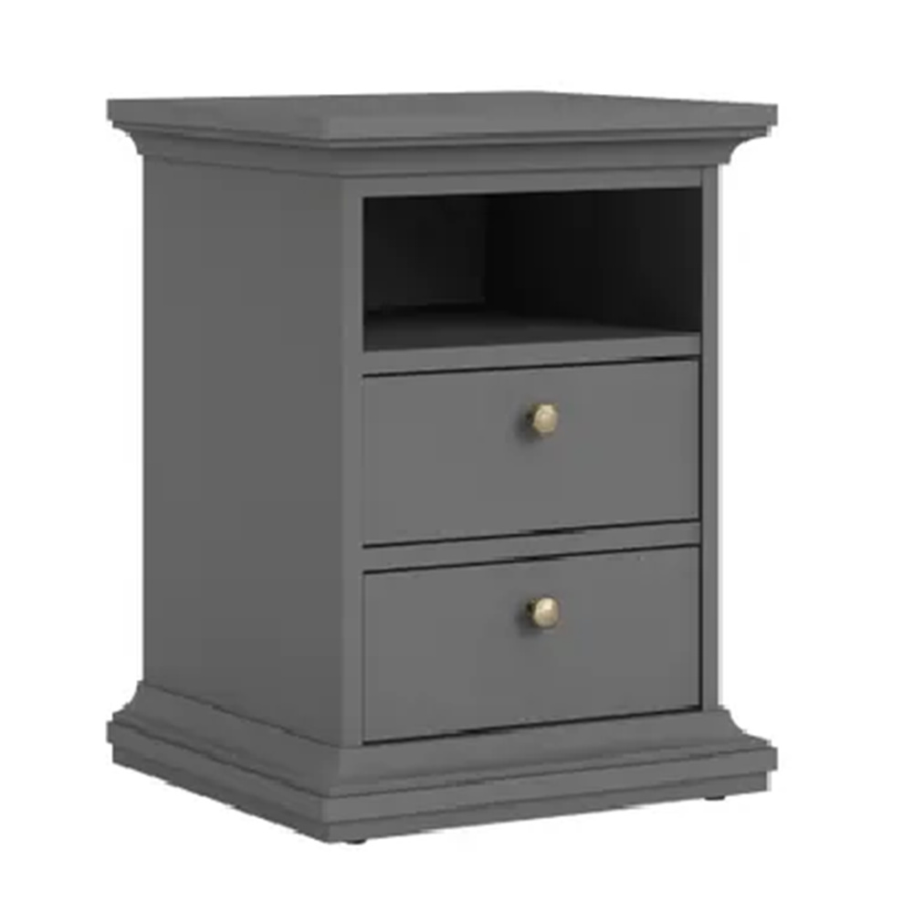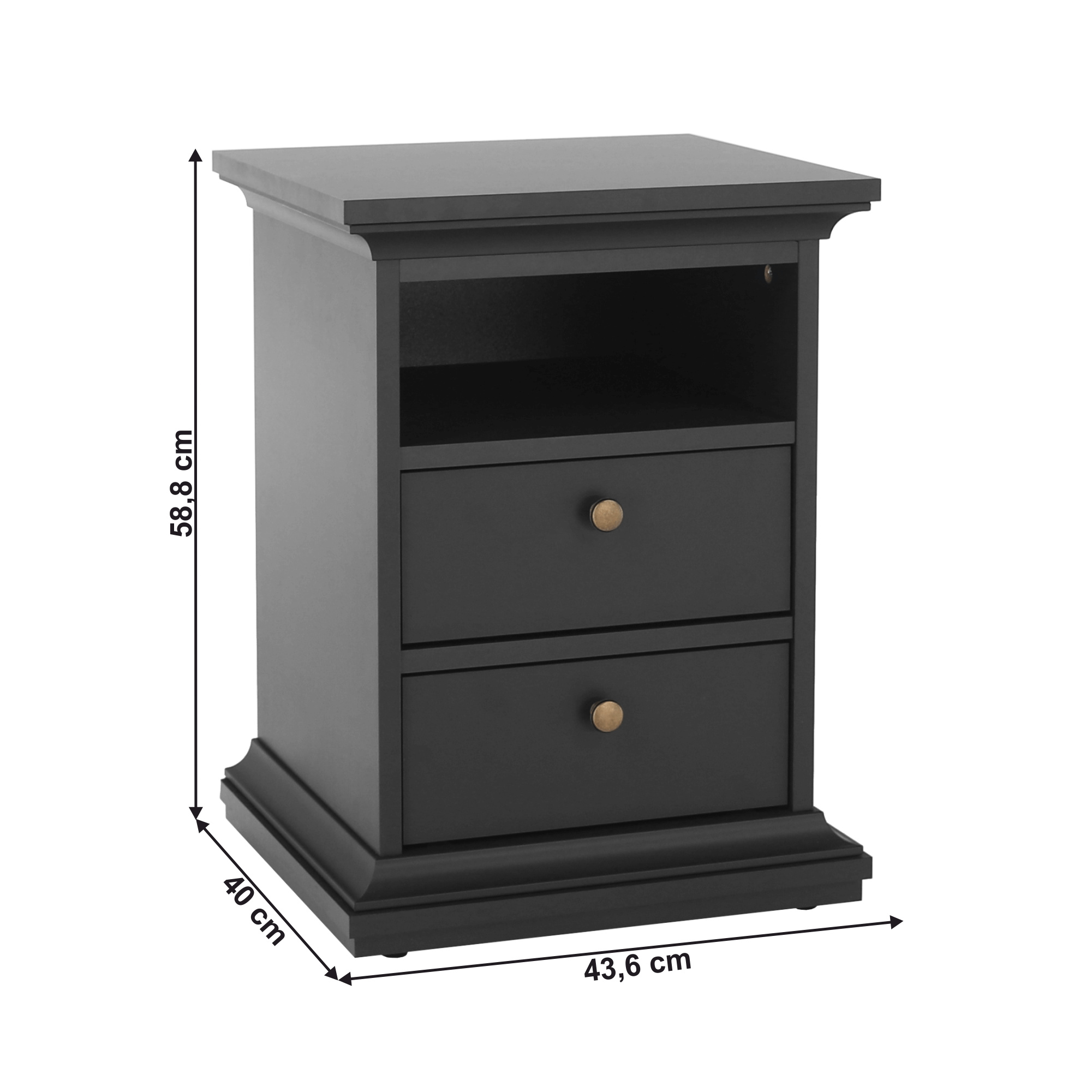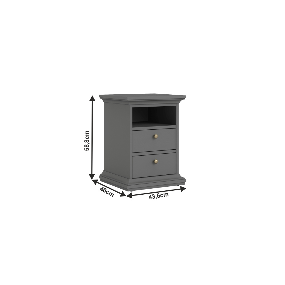 Materiál: DTD laminovaná/MDF lakovaná Barva: šedá Rozměry (ŠxHxV): 43,6x40x58,8 cm Tloušťka materiálu: 18 mm Otevřený úložný prostor Dva šuplíky Kovové úchytky Provensálský styl Ozdobné lišty Dodáváno v demontu.