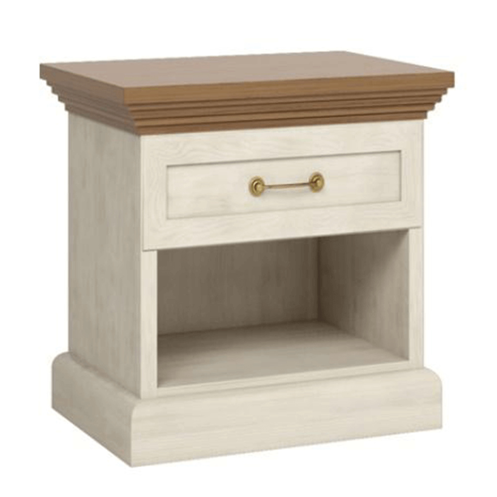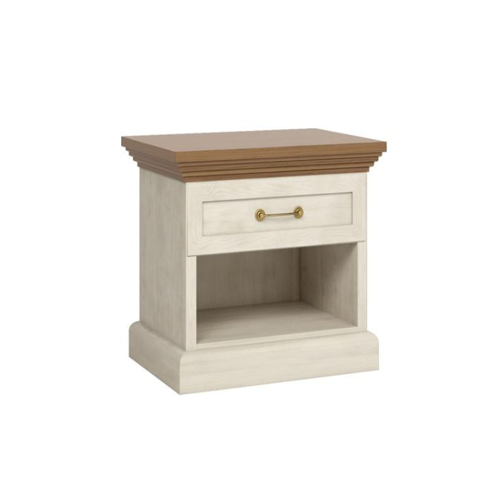 Noční stolek SN z elegantního sektorového systému Royal v provensálském stylu. Vhodná na zařízení obývacích pokojů či ložnic. Materiál: korpus DTD laminovaná + ozdobné lišty, kovová úchytka Barevné provedení: sosna skandinávská / dub divoký Rozměry ŠxHxV: 57x40x50 cm Tloušťka materiálu korpus: 15 mm Tloušťka materiálu vrchní desky: 22 mm Dodávané v demontu.