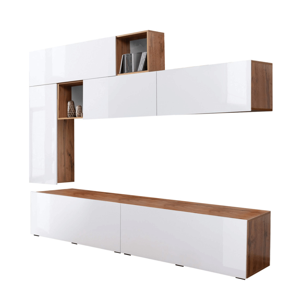 Obývací stěna, bílá extra vysoký lesk HG/dub wotan, MIRALDA