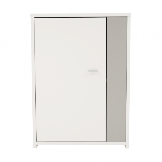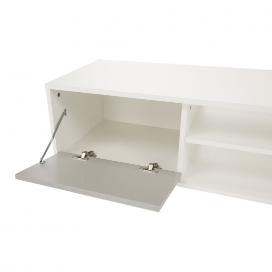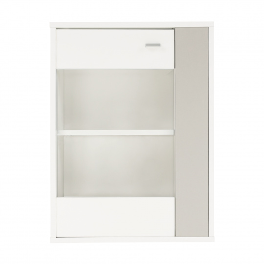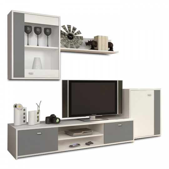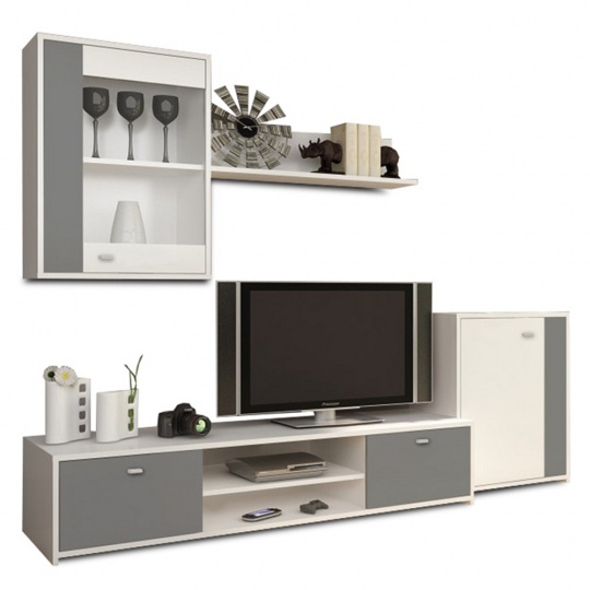 Obývací pokoj GENTA v barevném provedení bílá /šedá. Materiál laminovaná DTD a ABS hrany. Rozměry celé obývací stěny (ŠxHxV): 210x42x180 cm Rozměry RTV stolku (ŠxHxV): 160x42x32 cm Rozměry komody (ŠxHxV): 50x32x70 cm Rozměry závěsné vitríny (ŠxHxV): 50x22x67,5 cm Rozměry police (ŠxHxV): 60x18x20 cm Tloušťka materiálu: 16 mm Dodávané v demontu