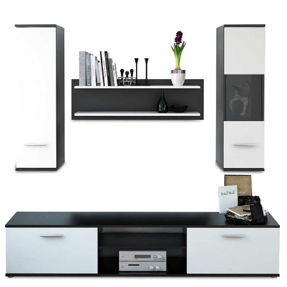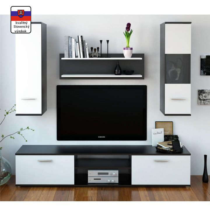Obývací stěna WAW NEW. RTV stolek, dvojpolica, dvě závěsné skříňky. Materiál laminovaná DTD. Barevné provedení černá / bílá Rozměry (ŠxHxV): 188x30x165 Tloušťka materiálu: 16 mm Dodávané v demontu