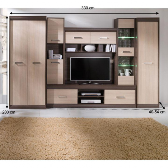 Obývací stěna KORINA Materiál: DTD laminovaná Barva: dub tmavý / dub jasný Rozměry obývací stěny (ŠxHxV): 330x40-54x200 cm Tloušťka materiálu: 16 mm Dodávané v demontu