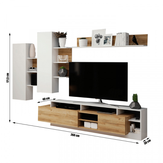 Obývací stěna, ALICANTE Materiál: DTD laminovaná Barva: dub grandson / bílá Rozměry obývací stěna (ŠxHxV): 260x30-40x171,5 cm Tloušťka materiálu: 16 mm Dodávané v demontu.