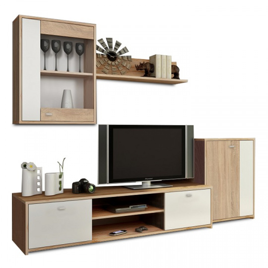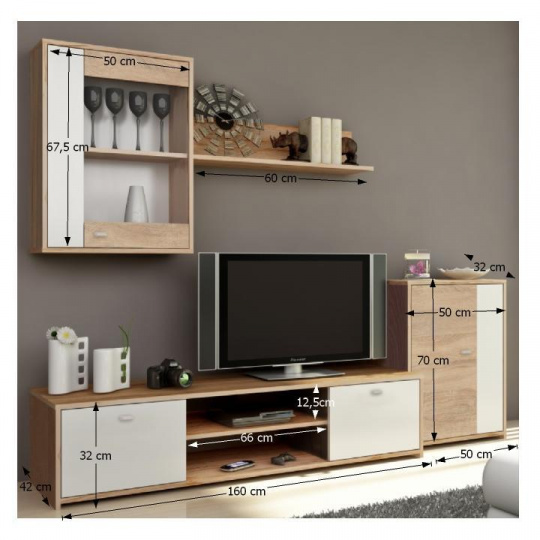 Obývací pokoj GENTA v barevném provedení bílá / dub sonoma. Materiál laminovaná DTD a ABS hrany. Rozměry celé obývací stěny (ŠxHxV): 210x42x180 cm Rozměry RTV stolku (ŠxHxV): 160x42x32 cm Rozměry komody (ŠxHxV): 50x32x70 cm Rozměry závěsné vitríny (ŠxHxV): 50x22x67,5 cm Rozměry police (ŠxHxV): 60x18x20 cm Tloušťka materiálu: 16 mm Dodávané v demontu