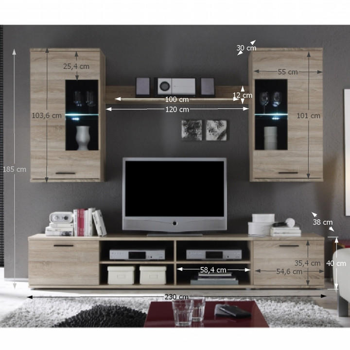 Materiál: fóliovaná DTD/sklo Barva: dub sonoma Rozměry (ŠxHxV): 230x38,5x190 cm Závěsná skříňka s vitrínou (ŠxHxV): 55x32x105 cm Stojací skříňka s vitrínou (ŠxHxV): 55x32x106 cm RTV stolek (ŠxHxV): 175x38x41 cm Police (ŠxHxV): 120x18x12 cm Nosnost závěsné skříňky s vitrínou: 10kg Nosnost stojící skříňky s vitrínou: 10kg Nosnost police: 5kg Tloušťka materiálu: 16 mm Dodáváno s LED osvětlením Dvoubodové LED osvětlení Barva LED osvětlení: studená bílá Dodáváno v demontu