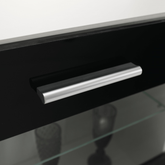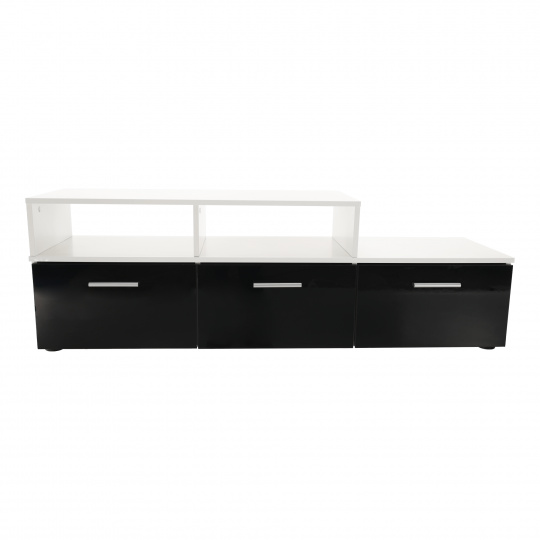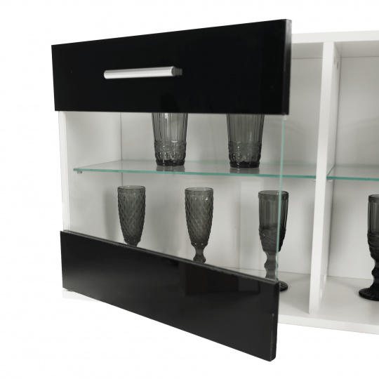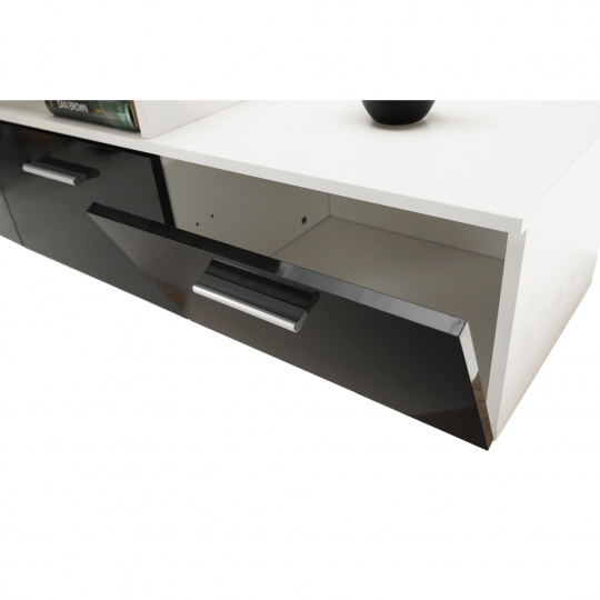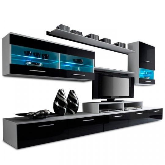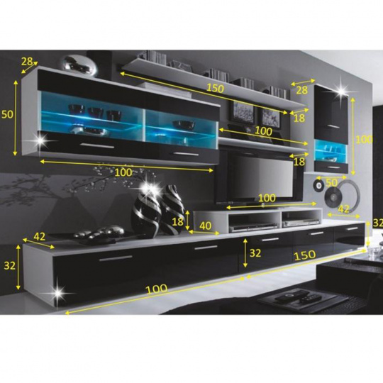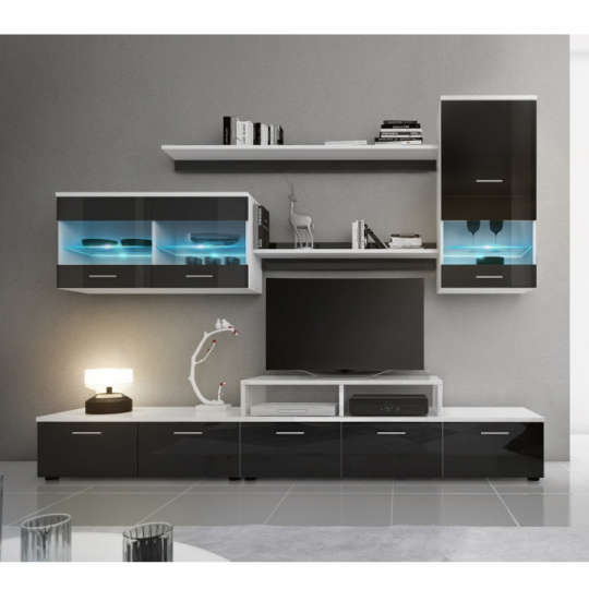 Obývací stěna s LED osvětlením LEO Materiál: DTD laminovaná Barva: bílá / černý extra vysoký lesk Rozměry (ŠxHxV): 250x42x180 cm Tloušťka materiálu vrchní desky spodní skříňky: 22 mm Tloušťka materiálu korpus: 16 mm Dodávané v demontu.