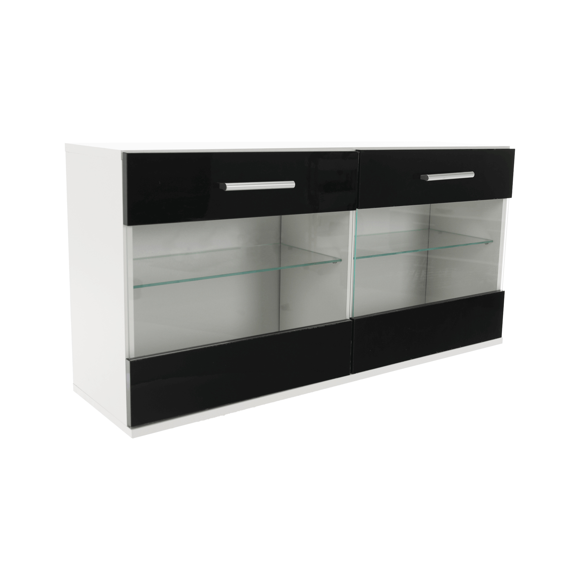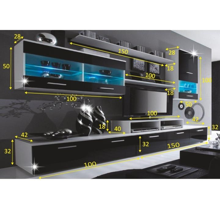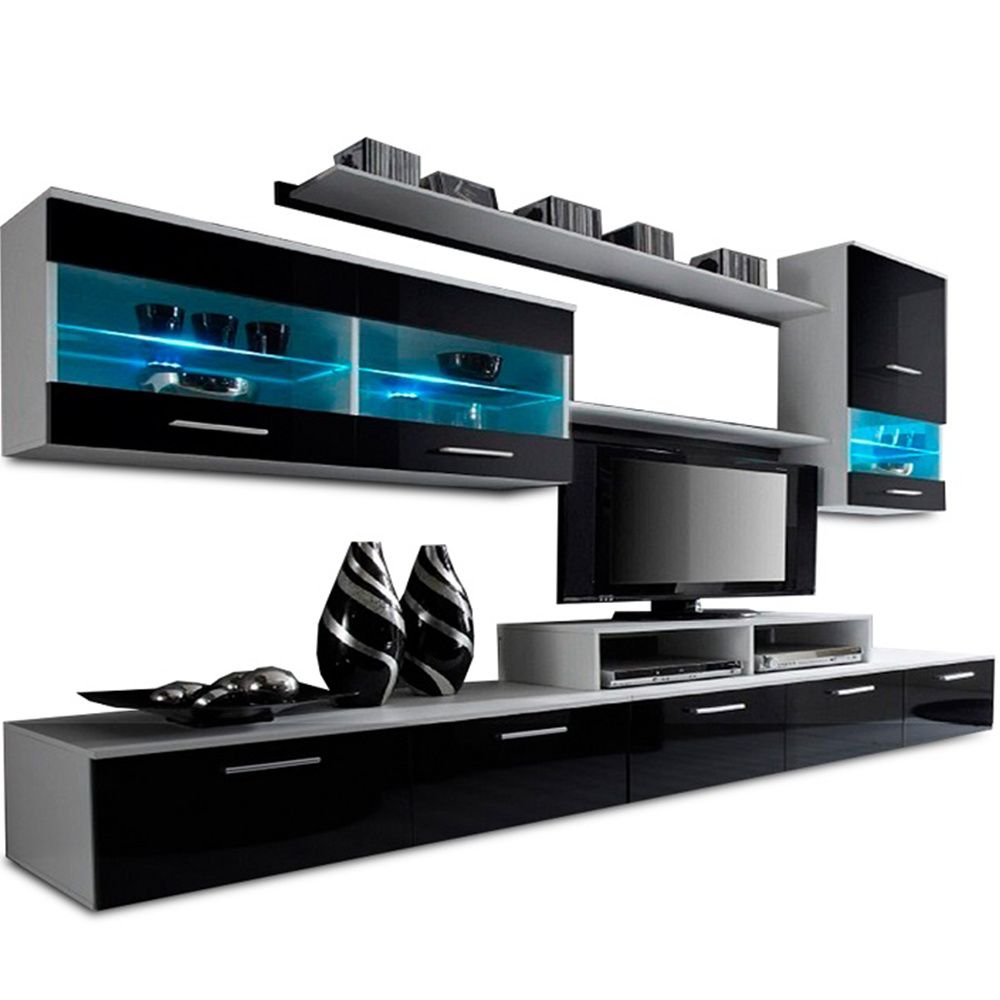 Obývací stěna s LED osvětlením LEO Materiál: DTD laminovaná Barva: bílá / černý extra vysoký lesk Rozměry (ŠxHxV): 250x42x180 cm Tloušťka materiálu vrchní desky spodní skříňky: 22 mm Tloušťka materiálu korpus: 16 mm Dodávané v demontu.