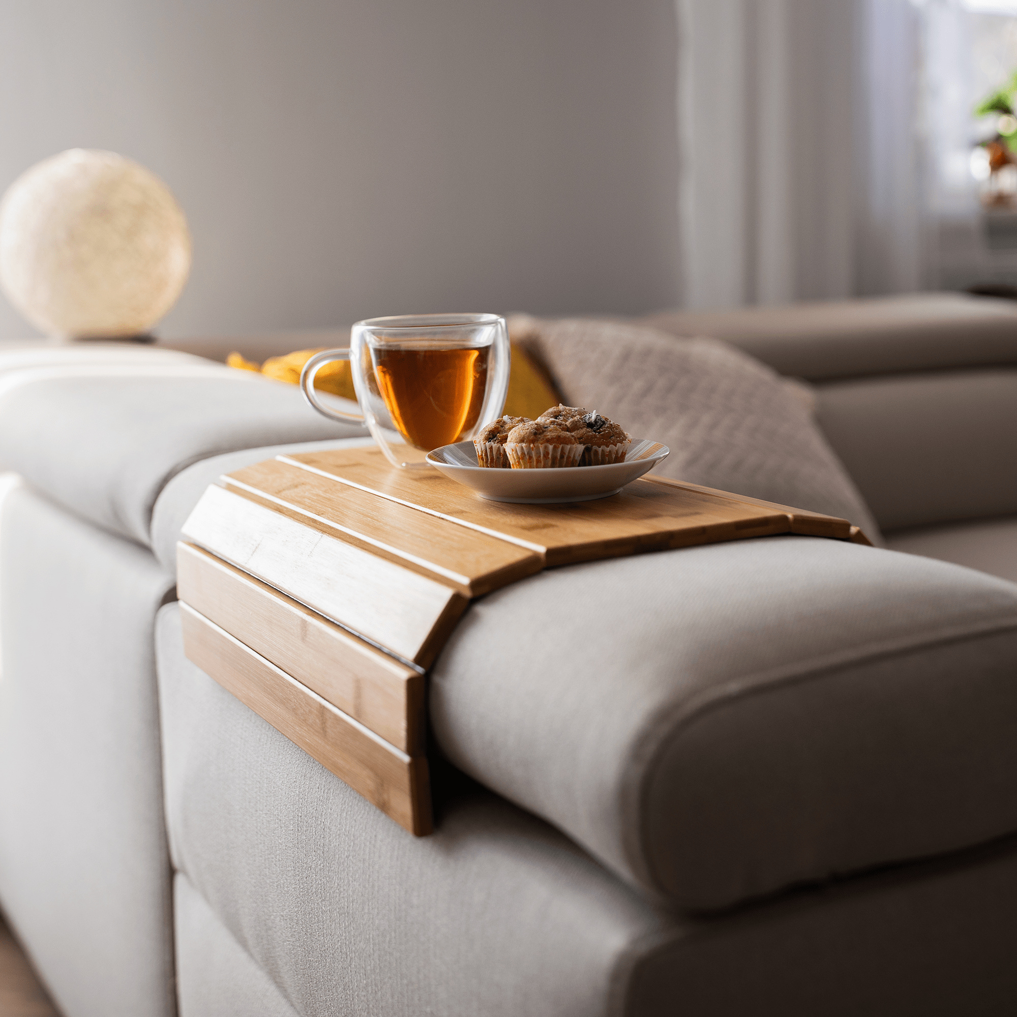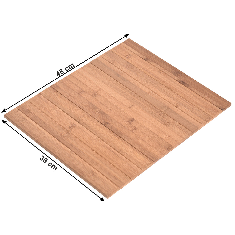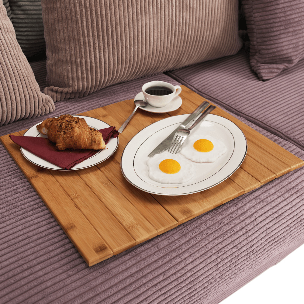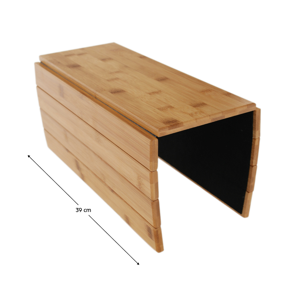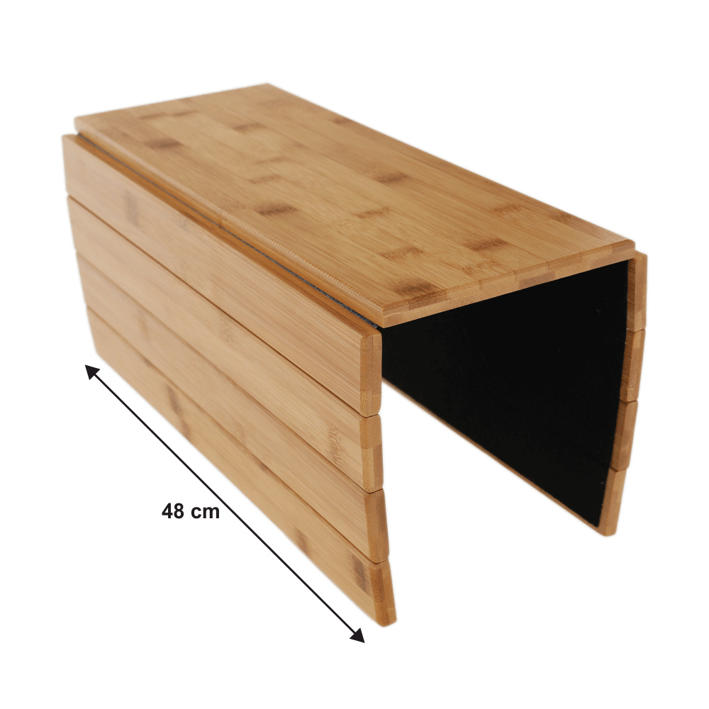Materiál: lakovaný bambus Barva: přírodní Materiál spodní část: plsť Rozměry (ŠxHxV): 48x39x1 cm Na opěrky rukou na sedačce nebo křesle Lze položit i na taburet a jiný povrch Jednoduše se skládá a přemisťuje Dodávané v monte