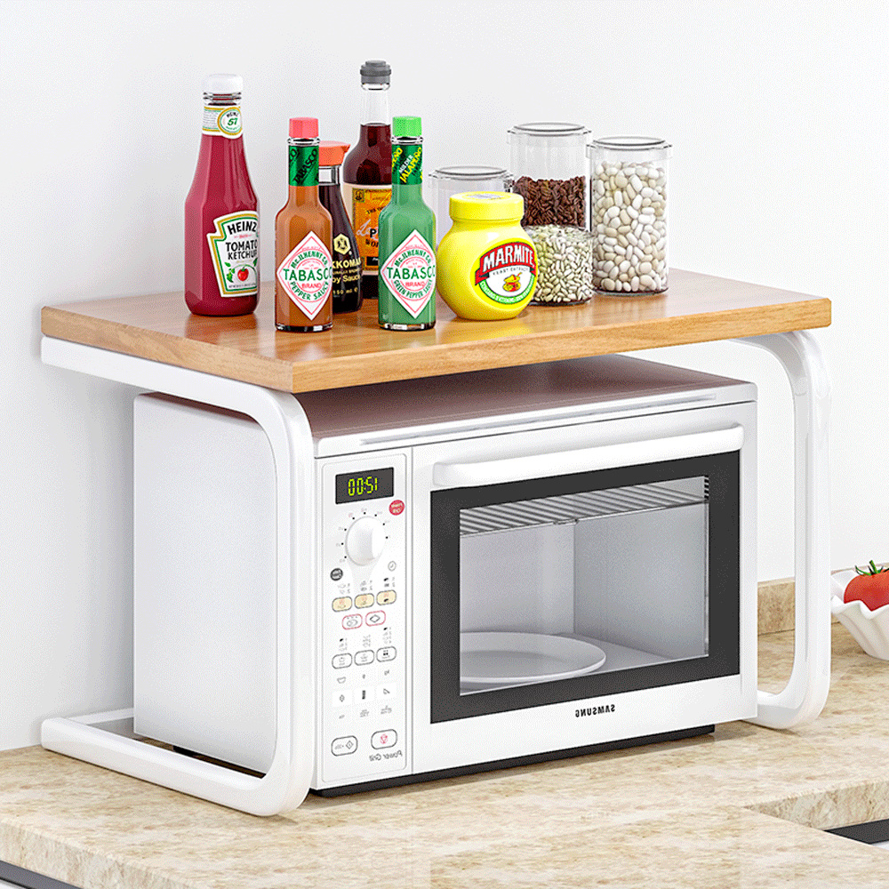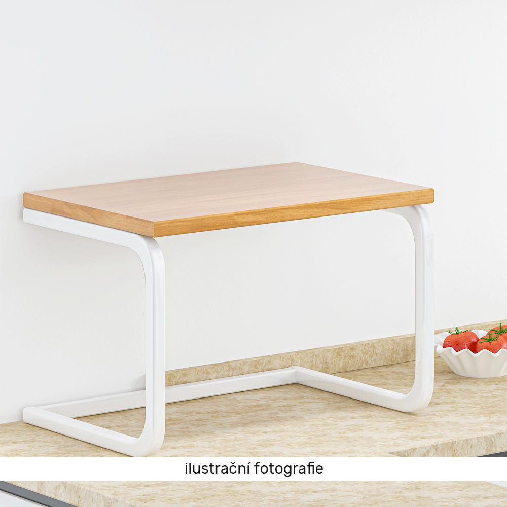 Materiál: kov / MDF Barva: bílá / dub natural Rozměry (ŠxHxV): 57x38x38 cm Tloušťka tyče: 2 cm Tloušťka materiálu desky: 1,2 cm Nosnost: 7 kg Víceúčelová Na odložení koření, dóz s cukrem, solí nebo kávou Úložný prostor pro mikrovlnou troubu Dodávané v demontu
