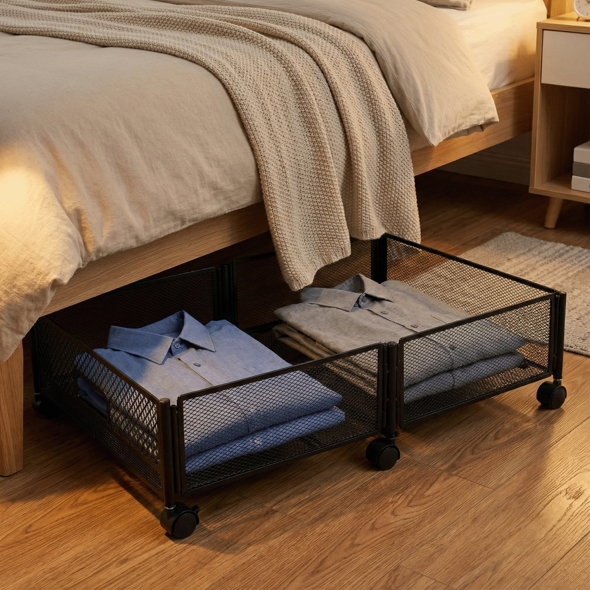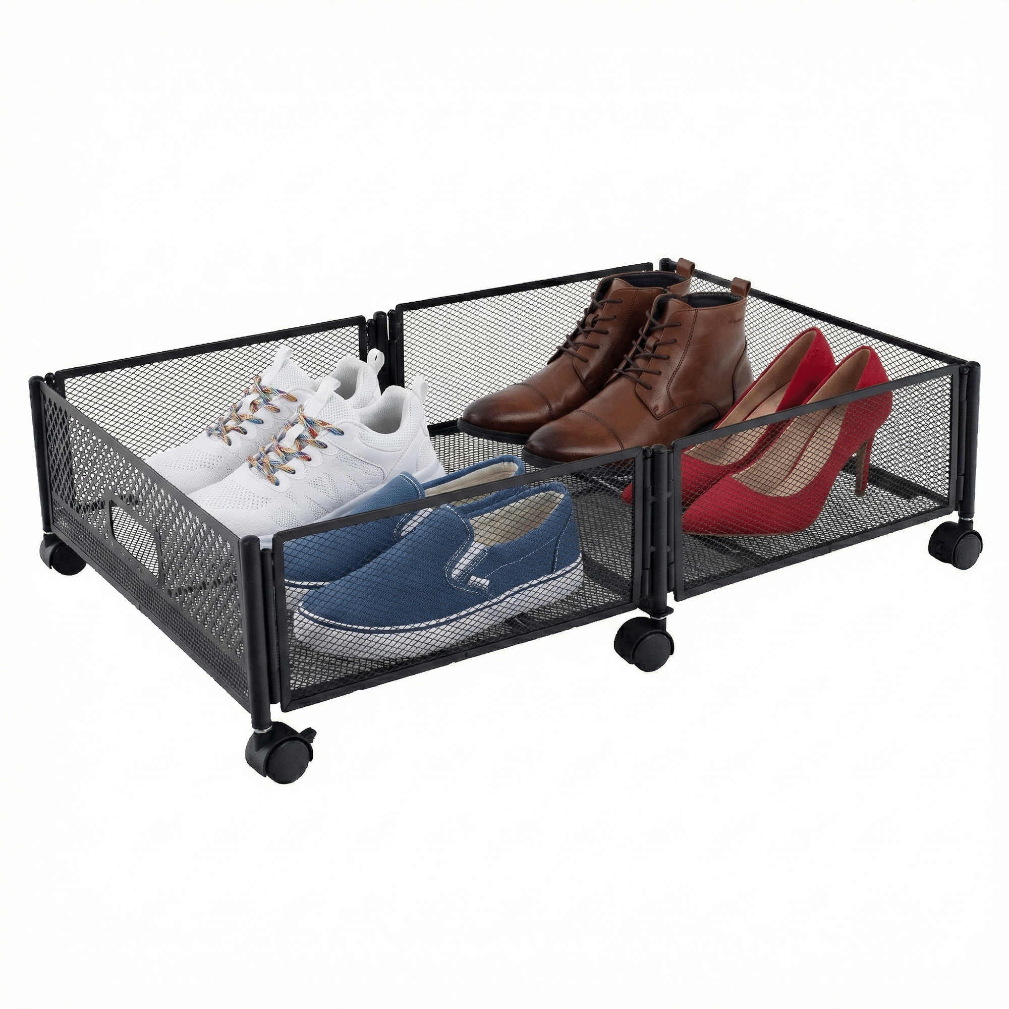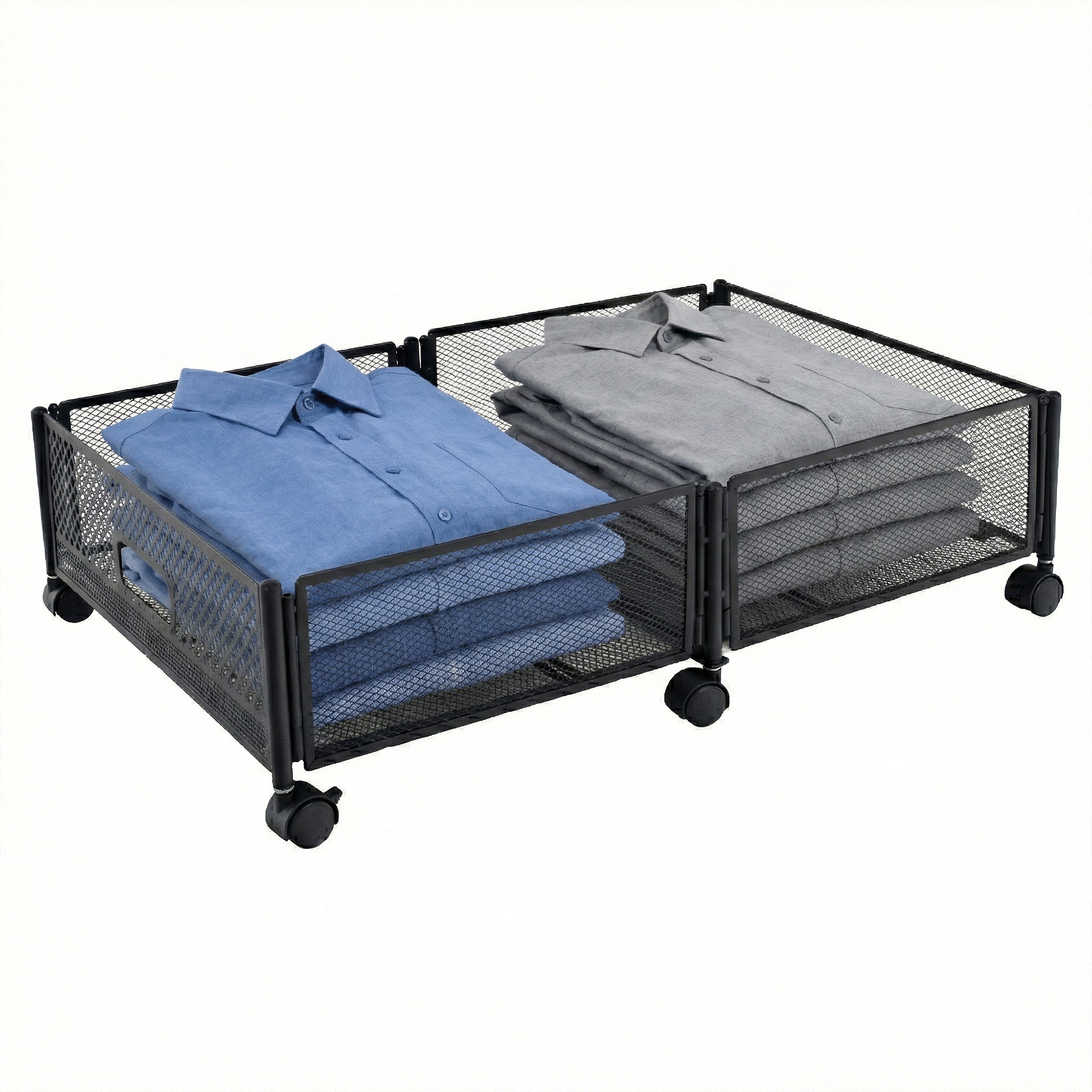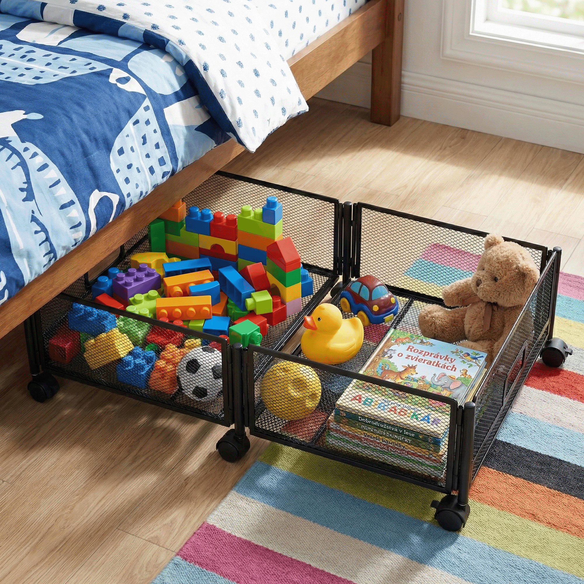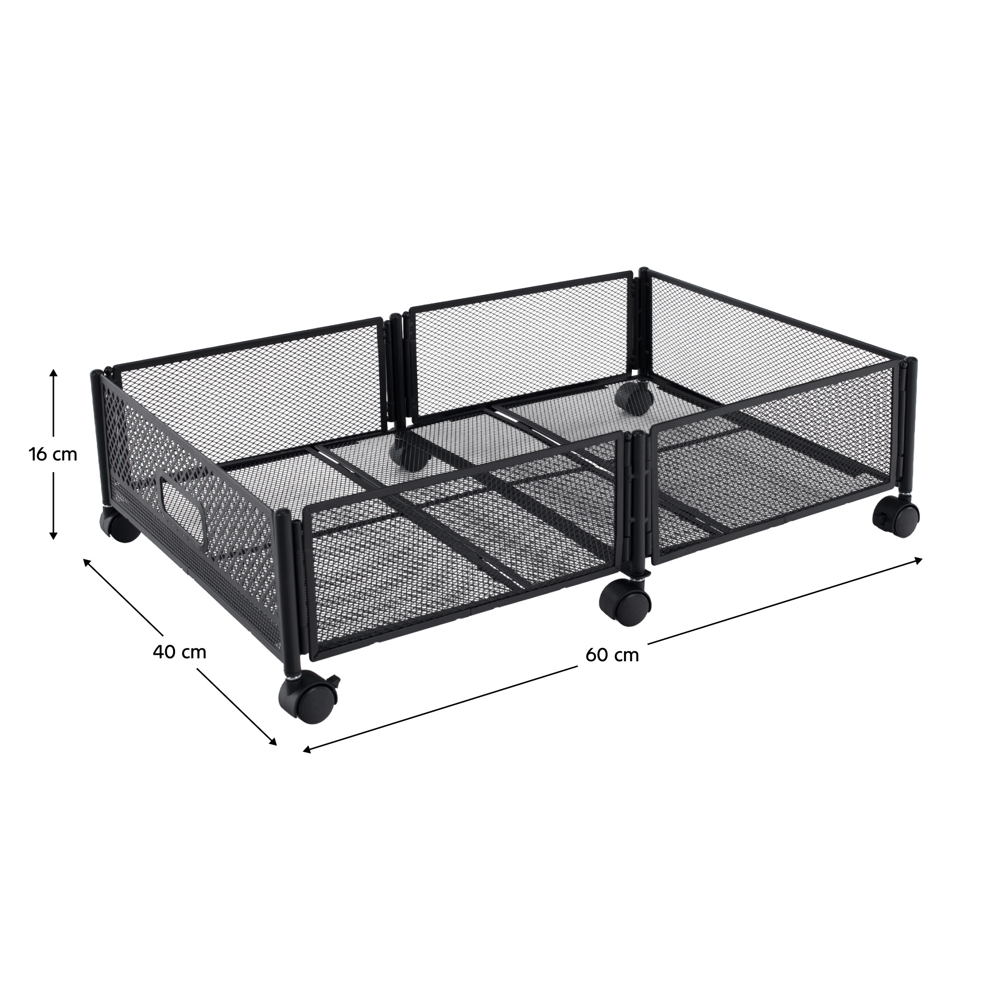 Materiál: kov Barva: černá Rozměry (ŠxHxV): 60x40x16 cm Skládací Na kolečkách Plastová kolečka s brzdou Jednoduchá manipulace Zabezpečená cirkulace vzduchu Pod postel Pro uskladnění oblečení, hraček a obuvi Multifunkční Praktický Dodáváno v demontu
