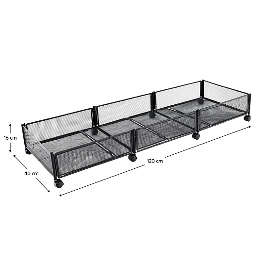 Materiál: kov Barva: černá Rozměry (ŠxHxV): 120x40x16 cm Skládací Na kolečkách Plastová kolečka s brzdou Jednoduchá manipulace Zabezpečená cirkulace vzduchu Pod postel Pro uskladnění oblečení, hraček a obuvi Multifunkční Praktický Dodáváno v demontu