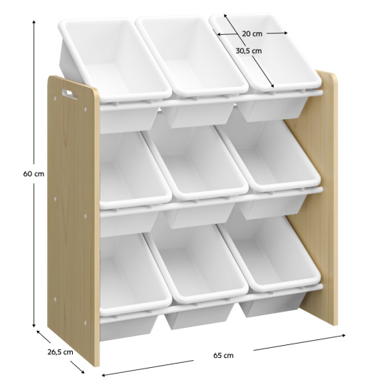 Materiál: MDF/plast/kov Barva: přírodní/bílá Rozměry (ŠxHxV): 65x26,5/31x67 cm Tloušťka materiálu MDF: 1,2 cm Tloušťka materiálu kov: 1,6 cm Regál Organizér Plastový odkládací prostor 9 plastových boxů Rozměry boxu (ŠxHxV): 20x30,5x12 cm Třípatrový Kovové tyče Výřezy po bocích Praktický Víceúčelový Na hračky, knihy, školní potřeby Vhodný do dětských pokojů Dodáváno v demontu