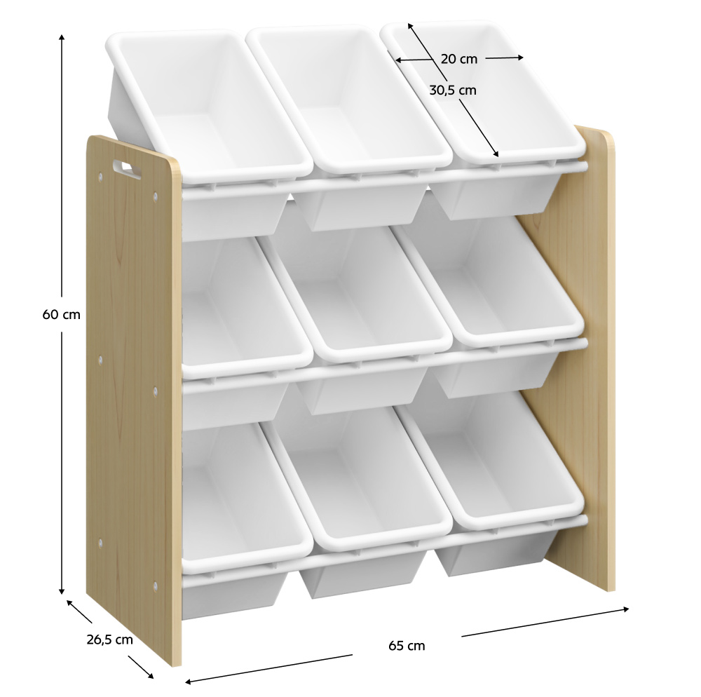 Materiál: MDF/plast/kov Barva: přírodní/bílá Rozměry (ŠxHxV): 65x26,5/31x67 cm Tloušťka materiálu MDF: 1,2 cm Tloušťka materiálu kov: 1,6 cm Regál Organizér Plastový odkládací prostor 9 plastových boxů Rozměry boxu (ŠxHxV): 20x30,5x12 cm Třípatrový Kovové tyče Výřezy po bocích Praktický Víceúčelový Na hračky, knihy, školní potřeby Vhodný do dětských pokojů Dodáváno v demontu