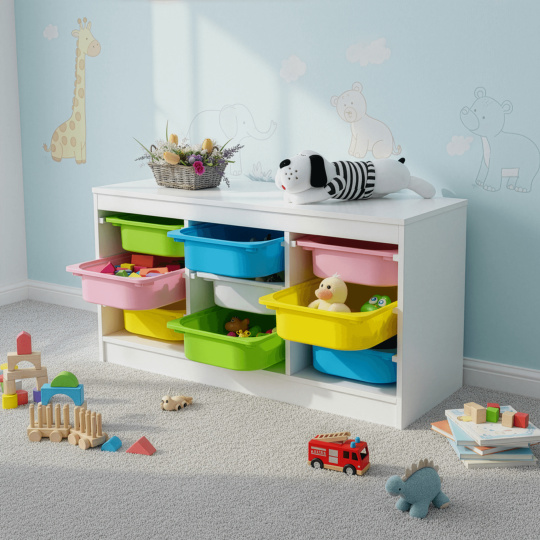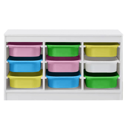 Materiál: MDF/plast Barva: bílá/růžová/zelená/žlutá/modrá Rozměry (ŠxHxV): 99x44x55 cm Nosnost boxu: 50 kg Nosnost vrchní desky: 120 kg Rozměry boxu (ŠxHxV): 30,5x41,5x10 cm Třípatrový 9 boxů Vhodný do dětského pokoje nebo kanceláře Na hračky, kancelářské potřeby nebo jiné drobnosti Regál Organizér Praktický Víceúčelový Dodáváno v demontu