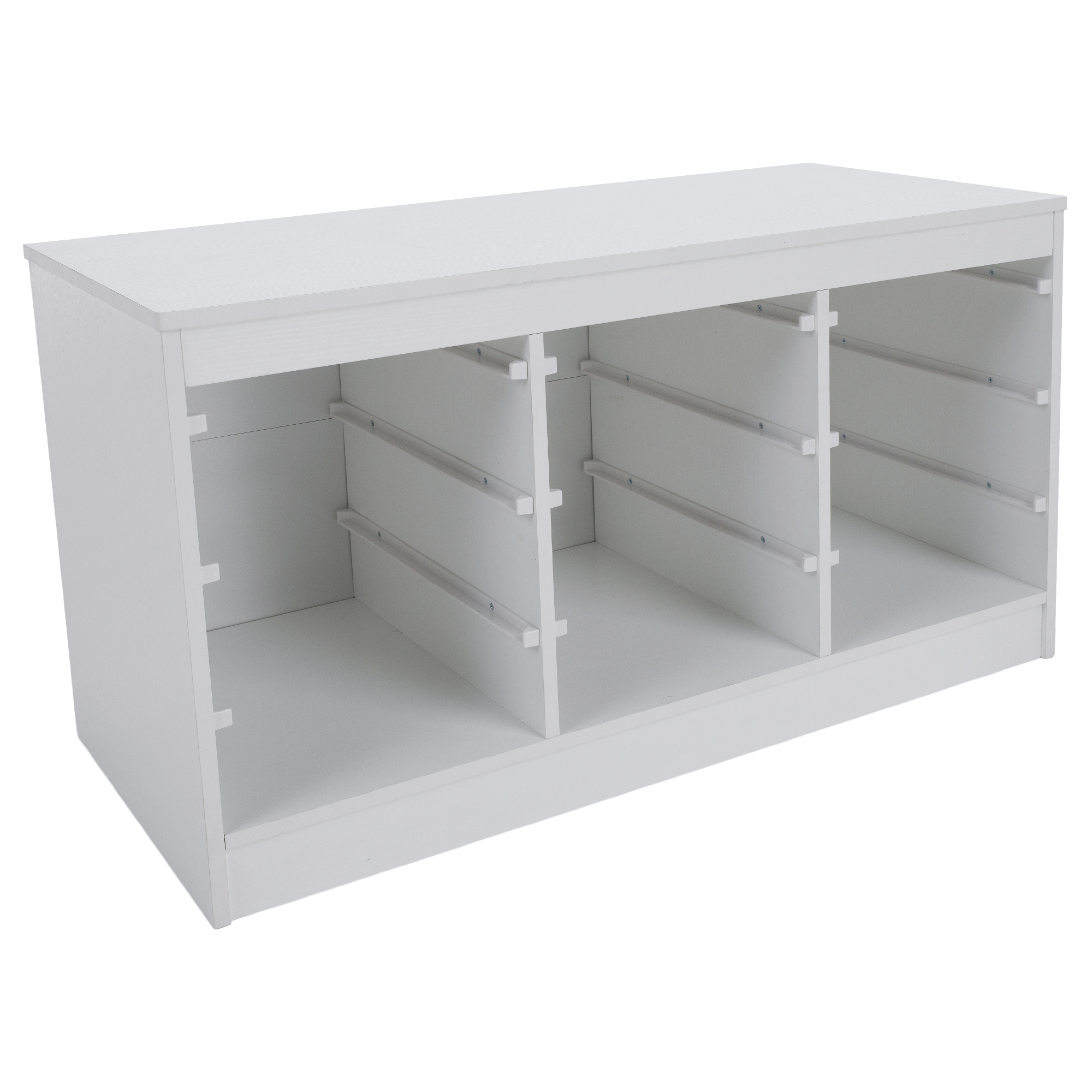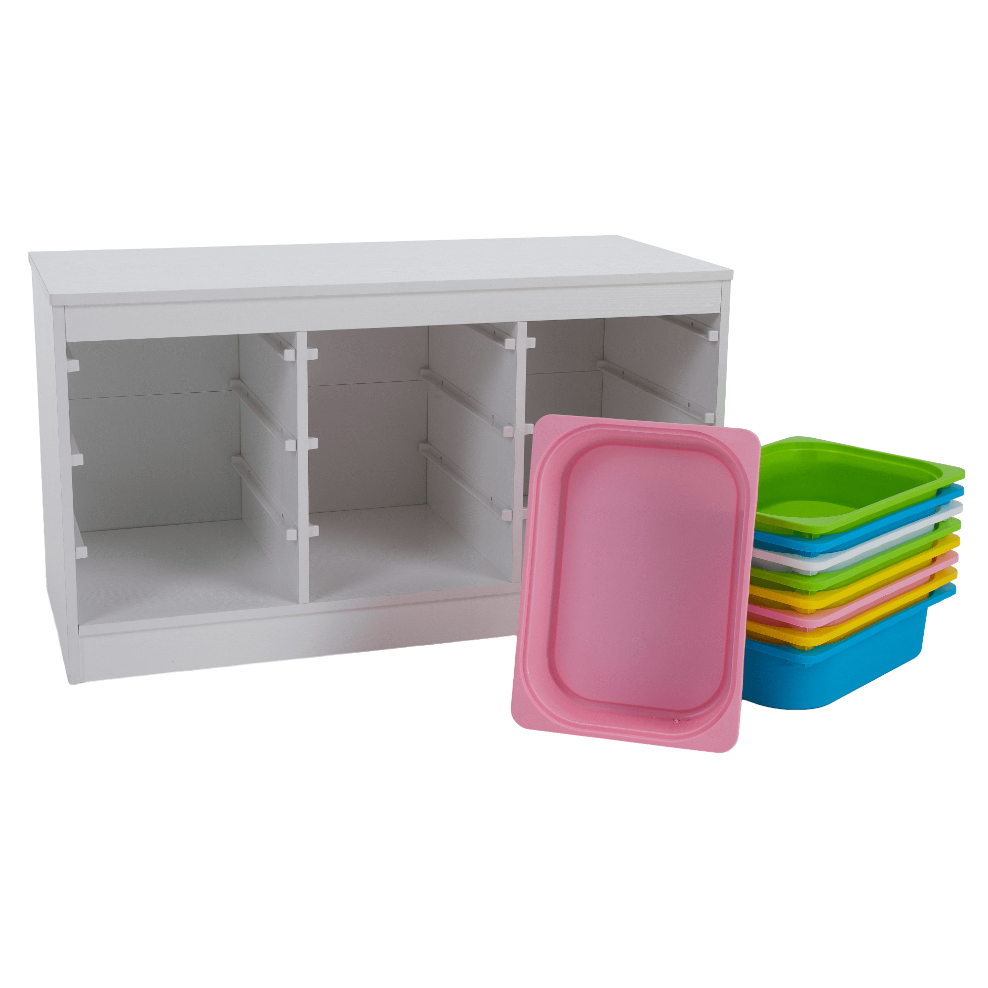 Materiál: MDF/plast Barva: bílá/růžová/zelená/žlutá/modrá Rozměry (ŠxHxV): 99x44x55 cm Nosnost boxu: 50 kg Nosnost vrchní desky: 120 kg Rozměry boxu (ŠxHxV): 30,5x41,5x10 cm Třípatrový 9 boxů Vhodný do dětského pokoje nebo kanceláře Na hračky, kancelářské potřeby nebo jiné drobnosti Regál Organizér Praktický Víceúčelový Dodáváno v demontu