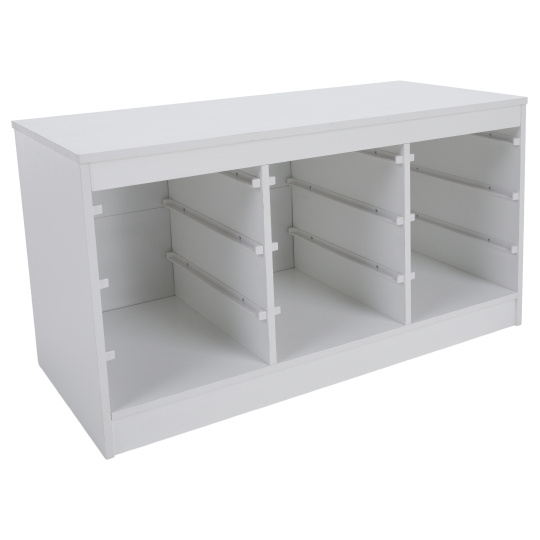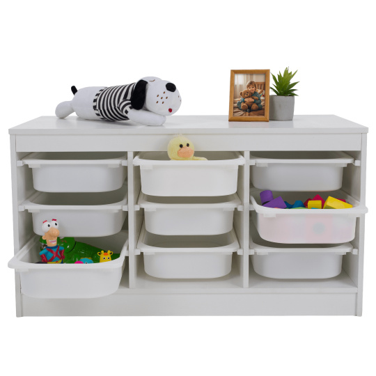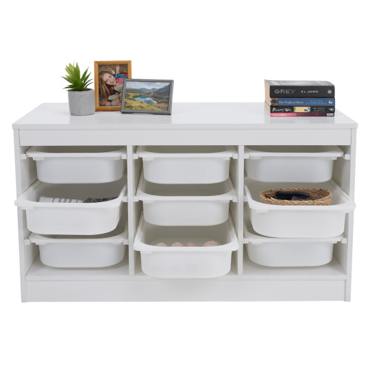 Materiál: MDF/plast Barva: bílá Rozměry (ŠxHxV): 99x44x55 cm Nosnost boxu: 50 kg Nosnost vrchní desky: 120 kg Rozměry boxu (ŠxHxV): 30,5x41,5x10 cm Třípatrový 9 boxů Vhodný do dětského pokoje nebo kanceláře Na hračky, kancelářské potřeby nebo jiné drobnosti Regál Organizér Praktický Víceúčelový Dodáváno v demontu