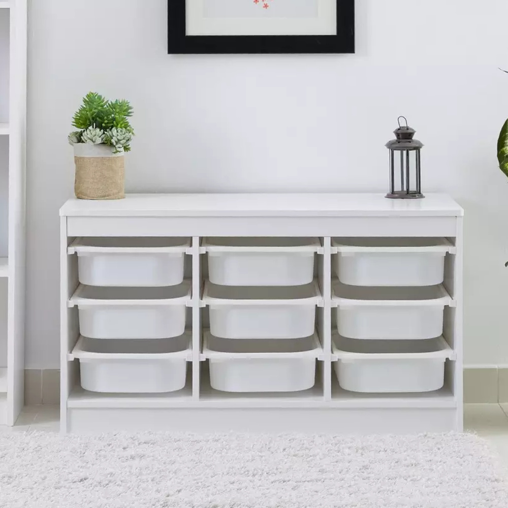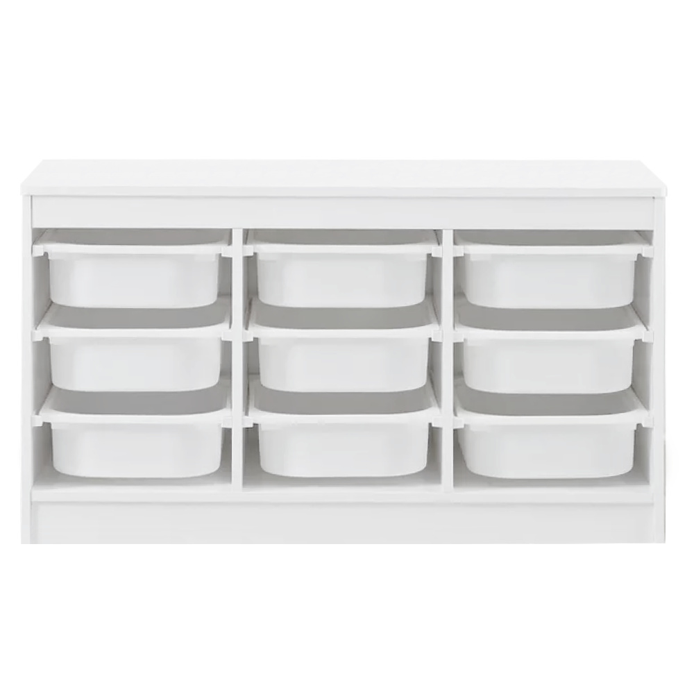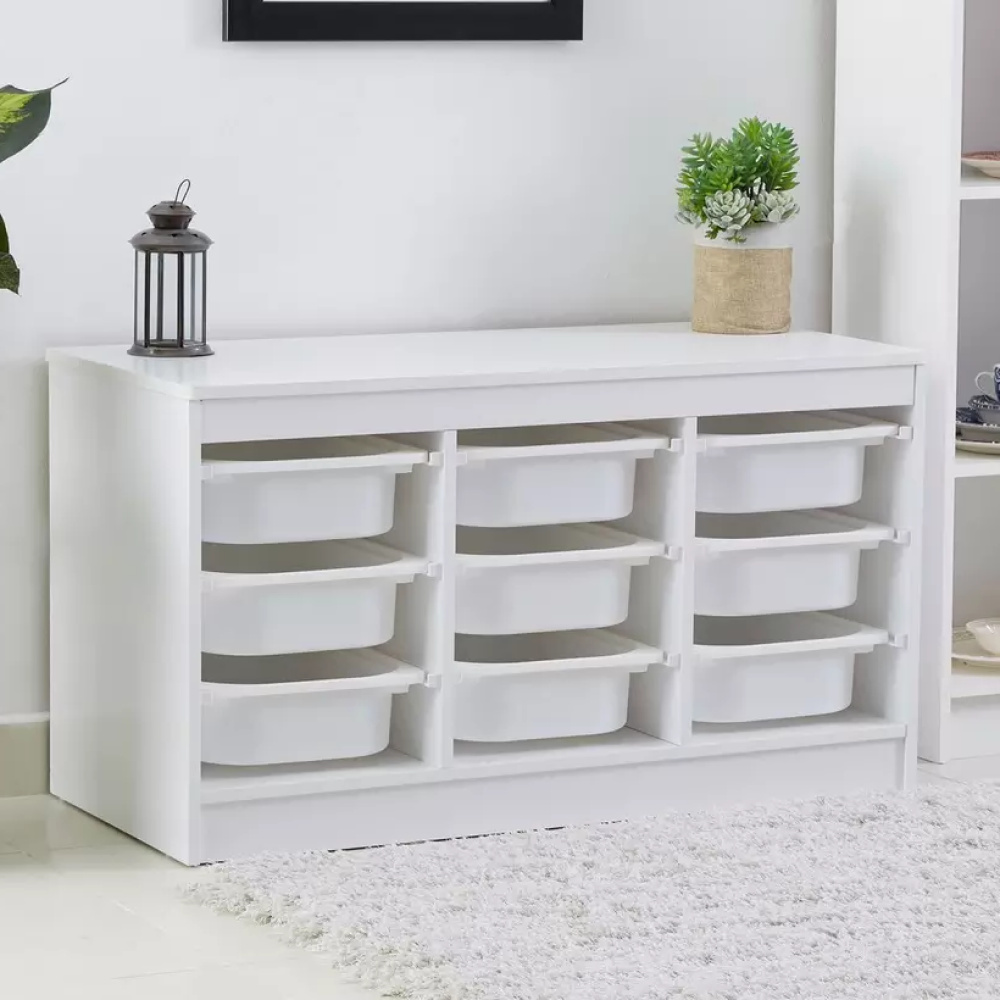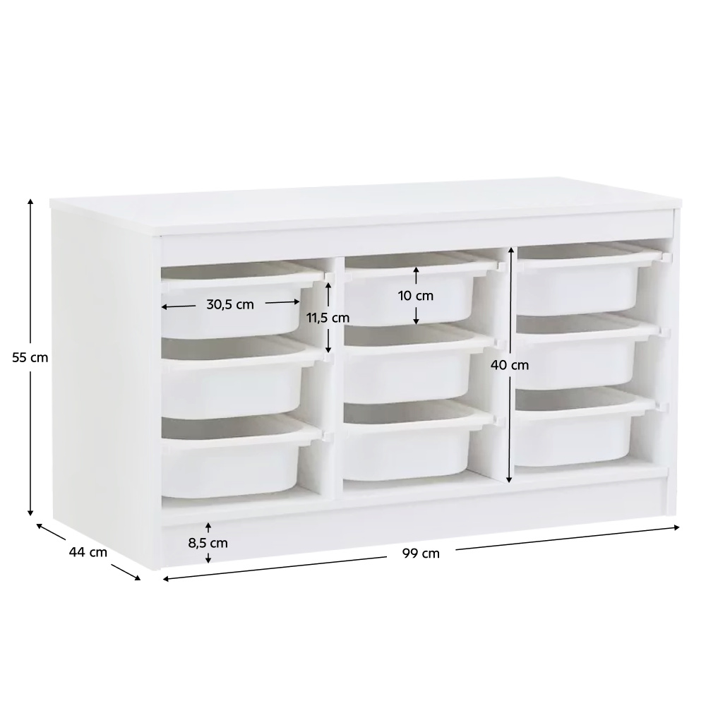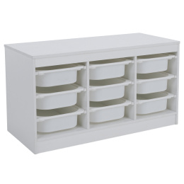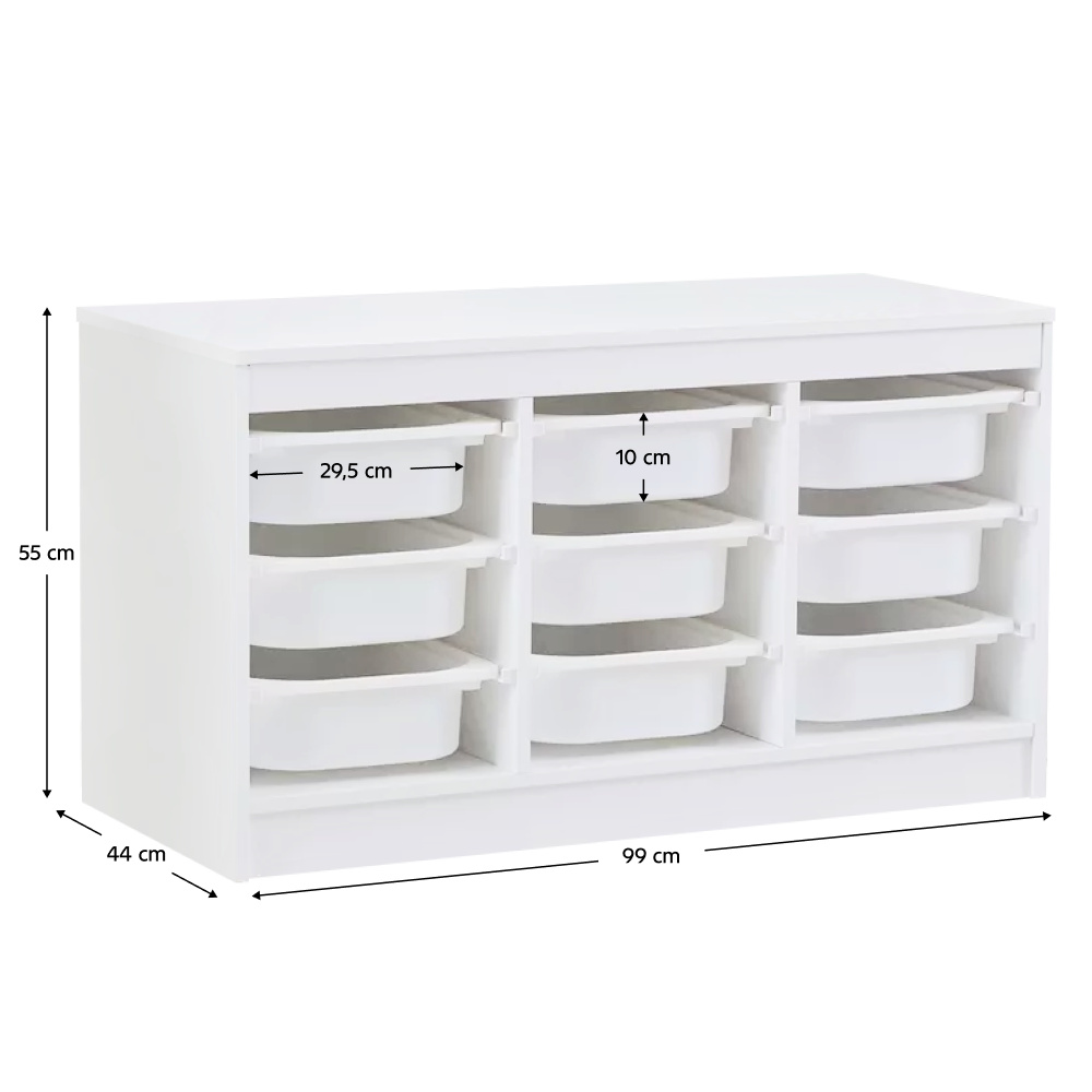 Materiál: MDF/plast Barva: bílá Rozměry (ŠxHxV): 99x44x55 cm Nosnost boxu: 50 kg Nosnost vrchní desky: 120 kg Rozměry boxu (ŠxHxV): 30,5x41,5x10 cm Třípatrový 9 boxů Vhodný do dětského pokoje nebo kanceláře Na hračky, kancelářské potřeby nebo jiné drobnosti Regál Organizér Praktický Víceúčelový Dodáváno v demontu
