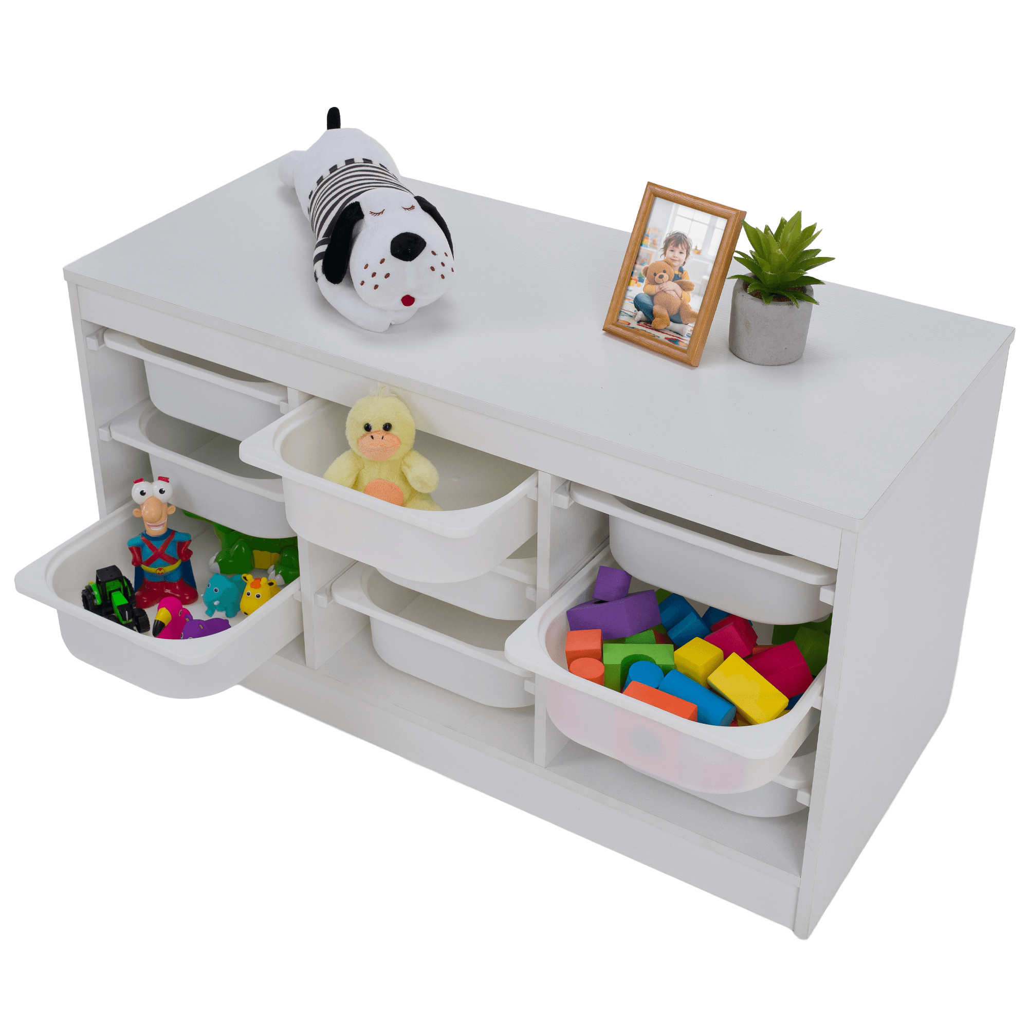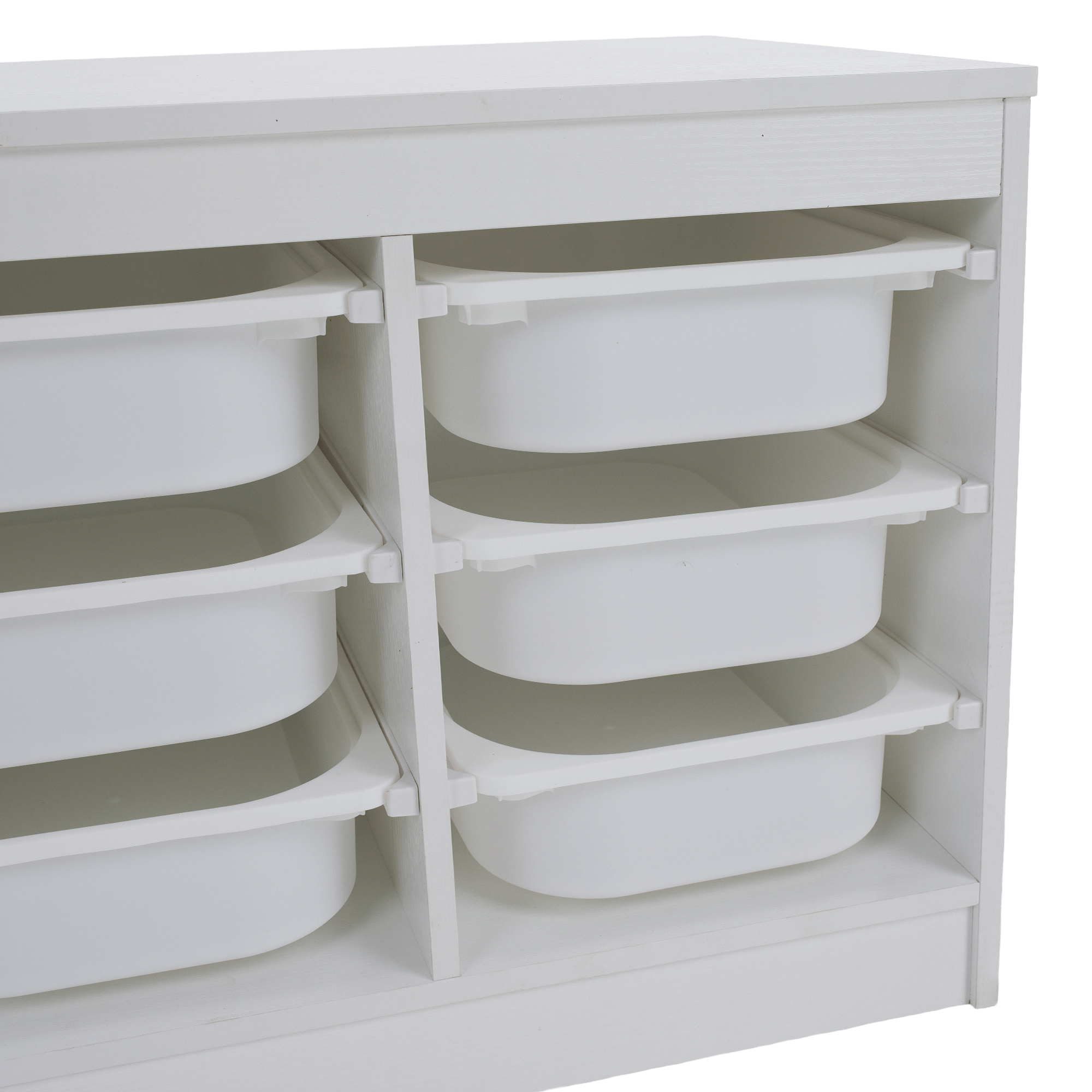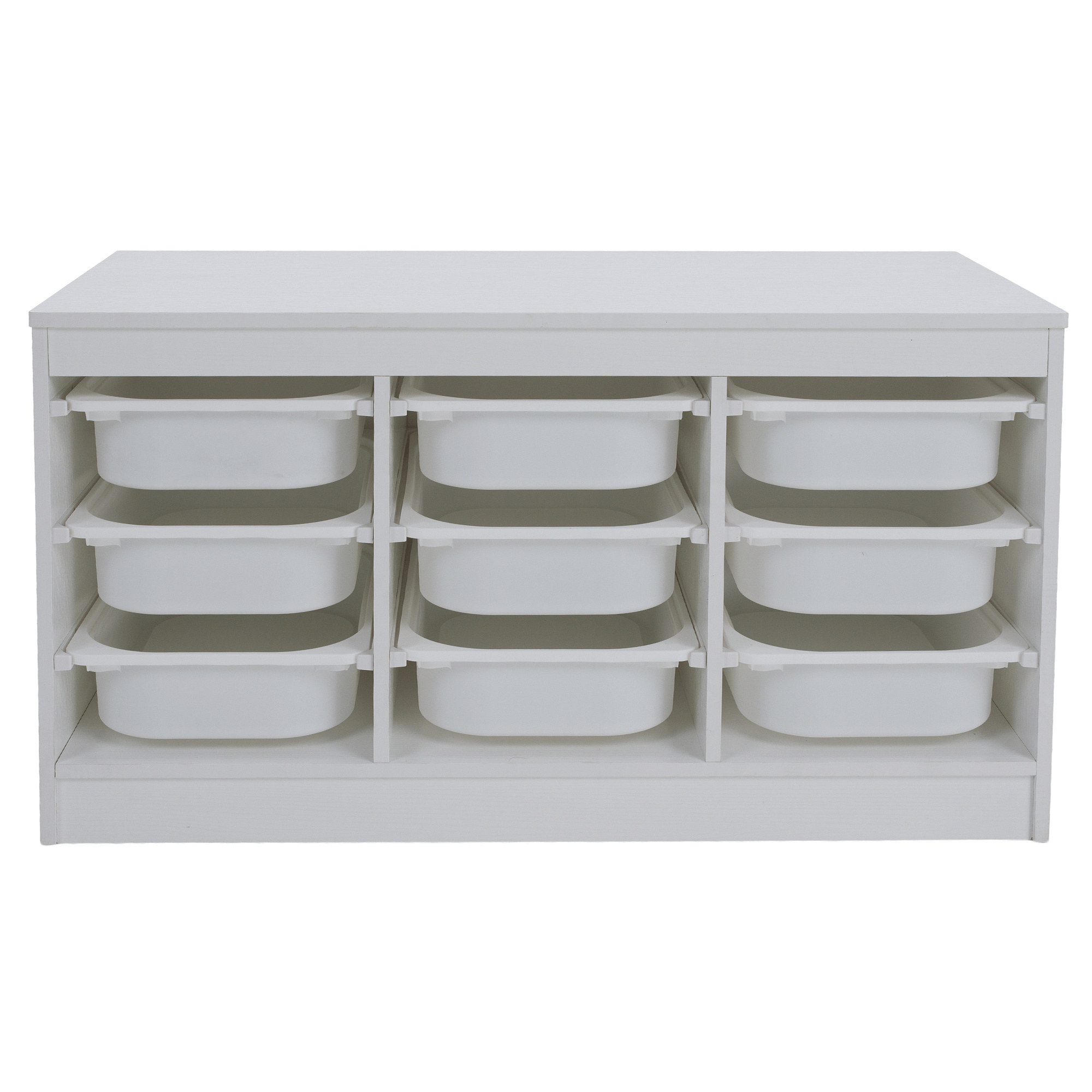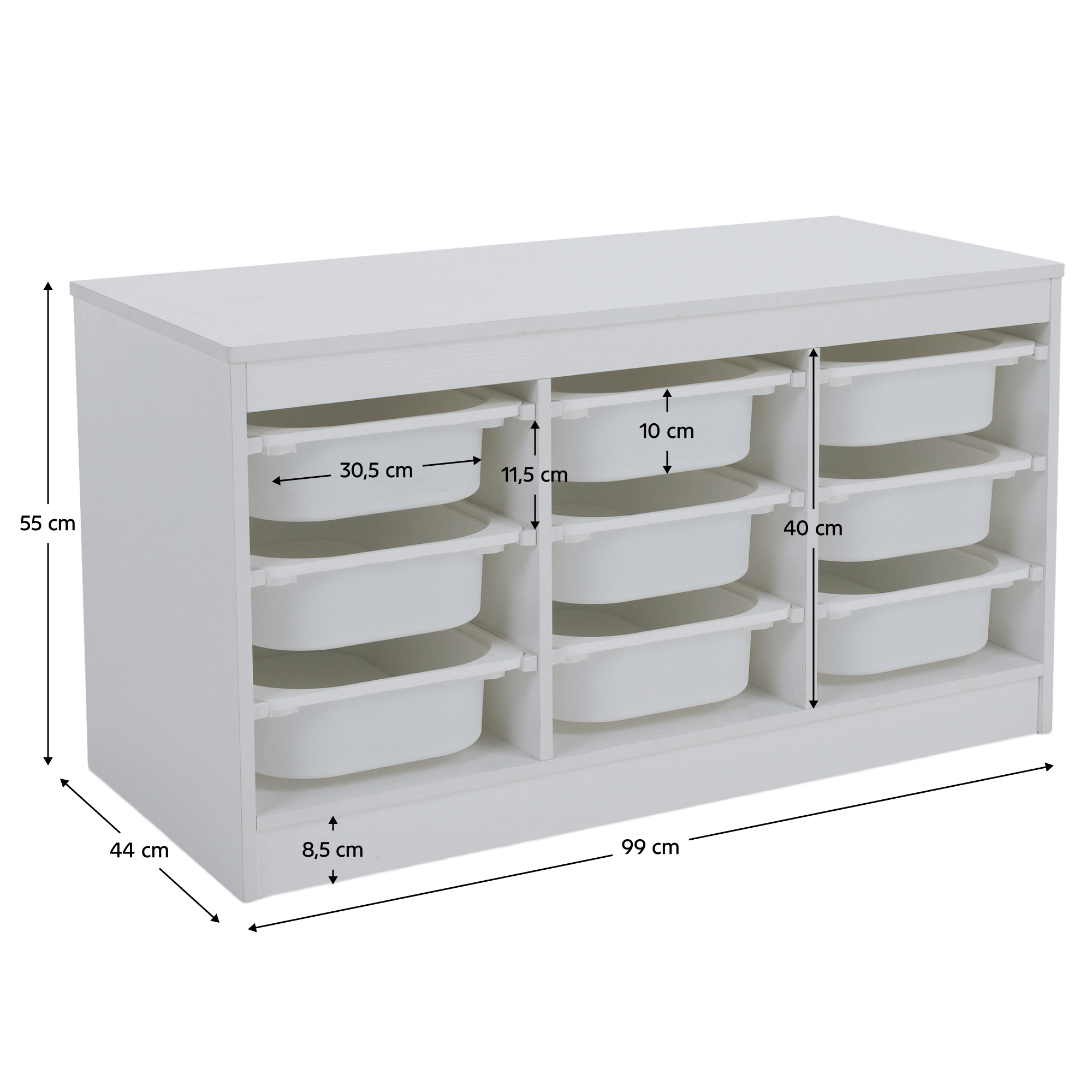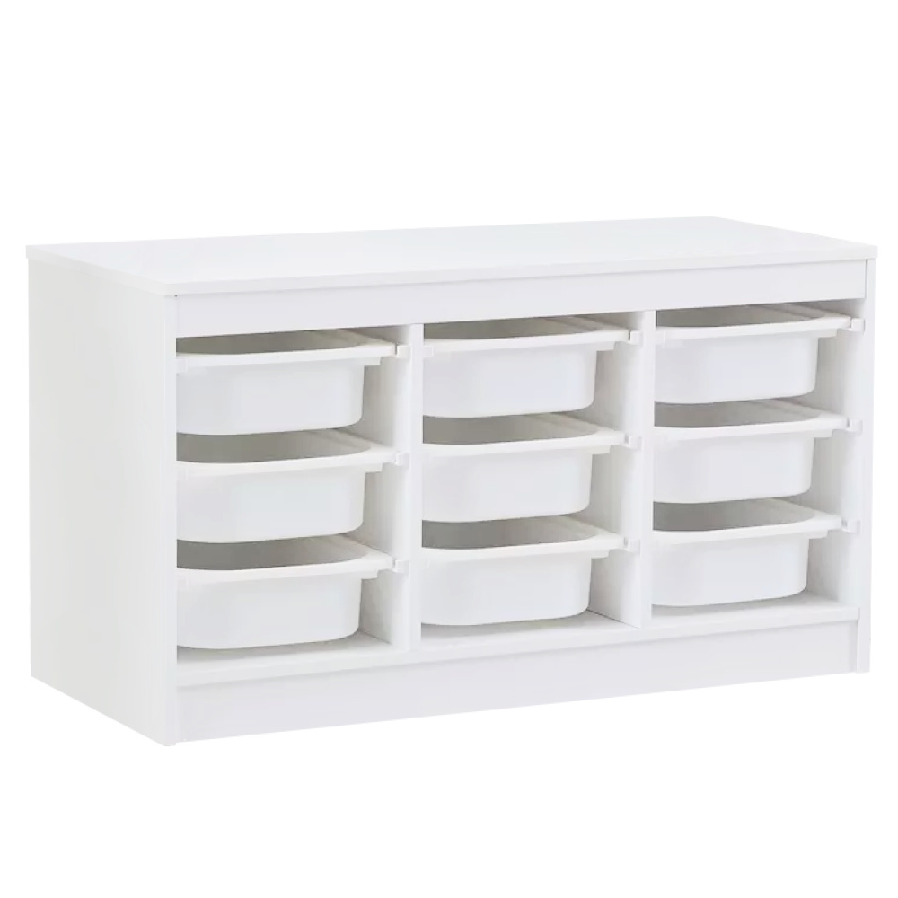 Materiál: MDF/plast Barva: bílá Rozměry (ŠxHxV): 99x44x55 cm Nosnost boxu: 50 kg Nosnost vrchní desky: 120 kg Rozměry boxu (ŠxHxV): 30,5x41,5x10 cm Třípatrový 9 boxů Vhodný do dětského pokoje nebo kanceláře Na hračky, kancelářské potřeby nebo jiné drobnosti Regál Organizér Praktický Víceúčelový Dodáváno v demontu