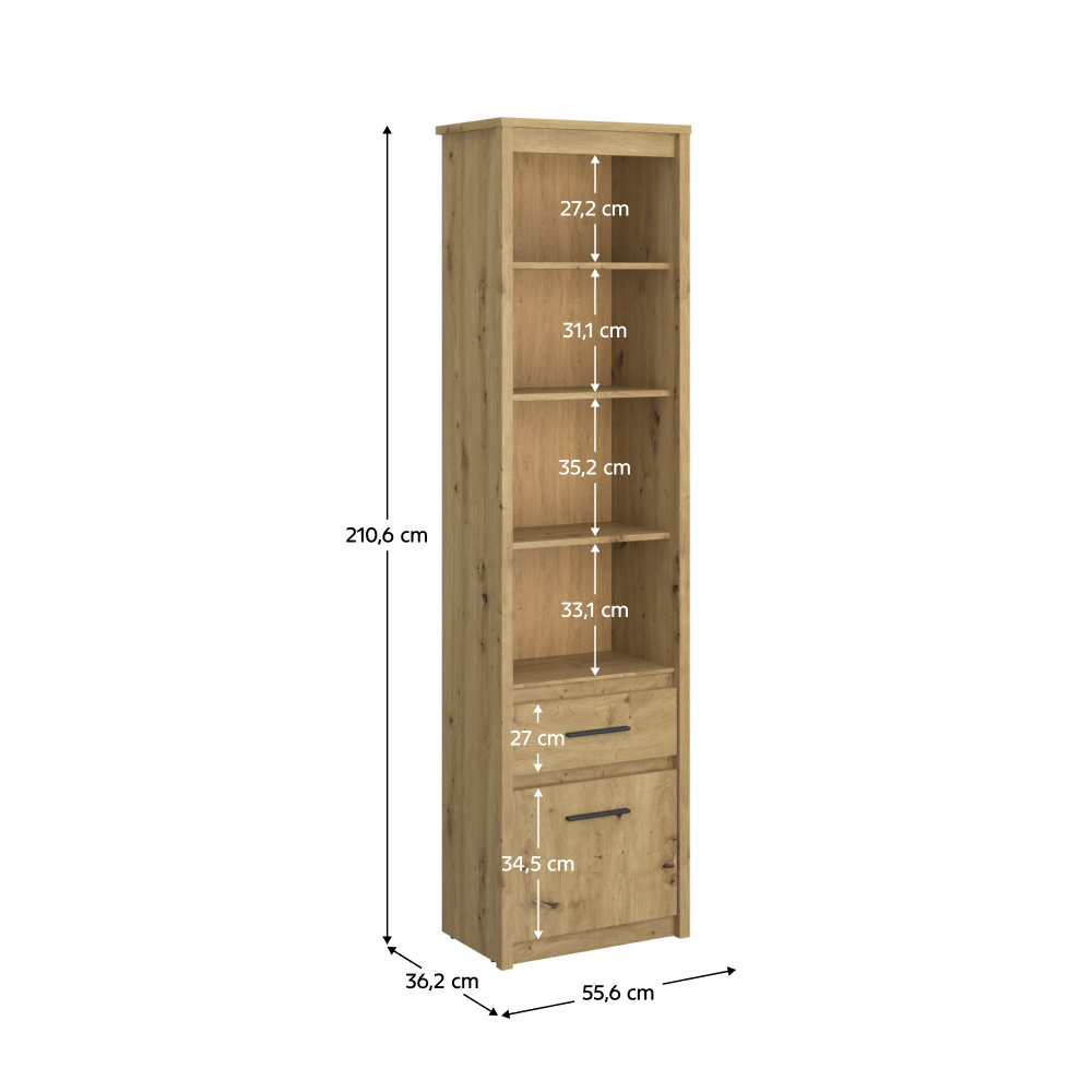 Materiál: DTD laminovaná/ABS hrany Barva: dub artisan Rozměry (ŠxHxV): 55,6x36,2x210,6 cm Tloušťka materiálu: 1,6-3,2 cm Plastové úchytky Barva úchytek: černá Otevřený i uzavřený úložný prostor Kombinovaný regál Skříňka s dvířky Jeden šuplík Výška šuplíku: 27 cm Otevřené police Nosnost police: 5 kg Plastové nožičky Doporučujeme připevnit ke zdi Dodáváno v demontu