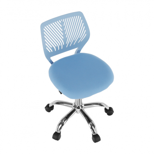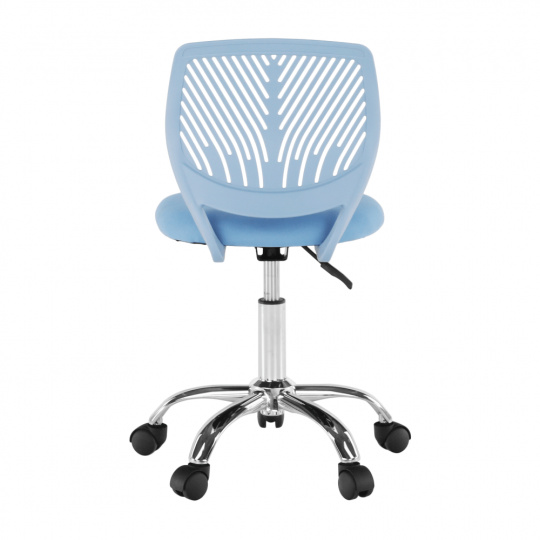 Materiál: polyester / kov Oděruodolnost textilie podle testu Martindale: 100 000 oděrek Barva: modrá / chrom Rozměry (ŠxHxV): 53x53x74,5-86,5 cm Nastavitelná výška sedu: 42-54 cm Hloubka sedu: 38 cm Šířka sedu: 40 cm Výška zádové opěrky: 32 cm Šířka zádové opěrky: 36 cm Nosnost: 80 kg otočná S kolečky perforované opěradlo Dodávané v demontu