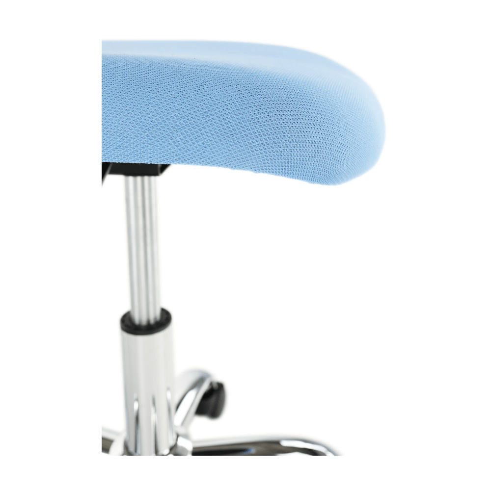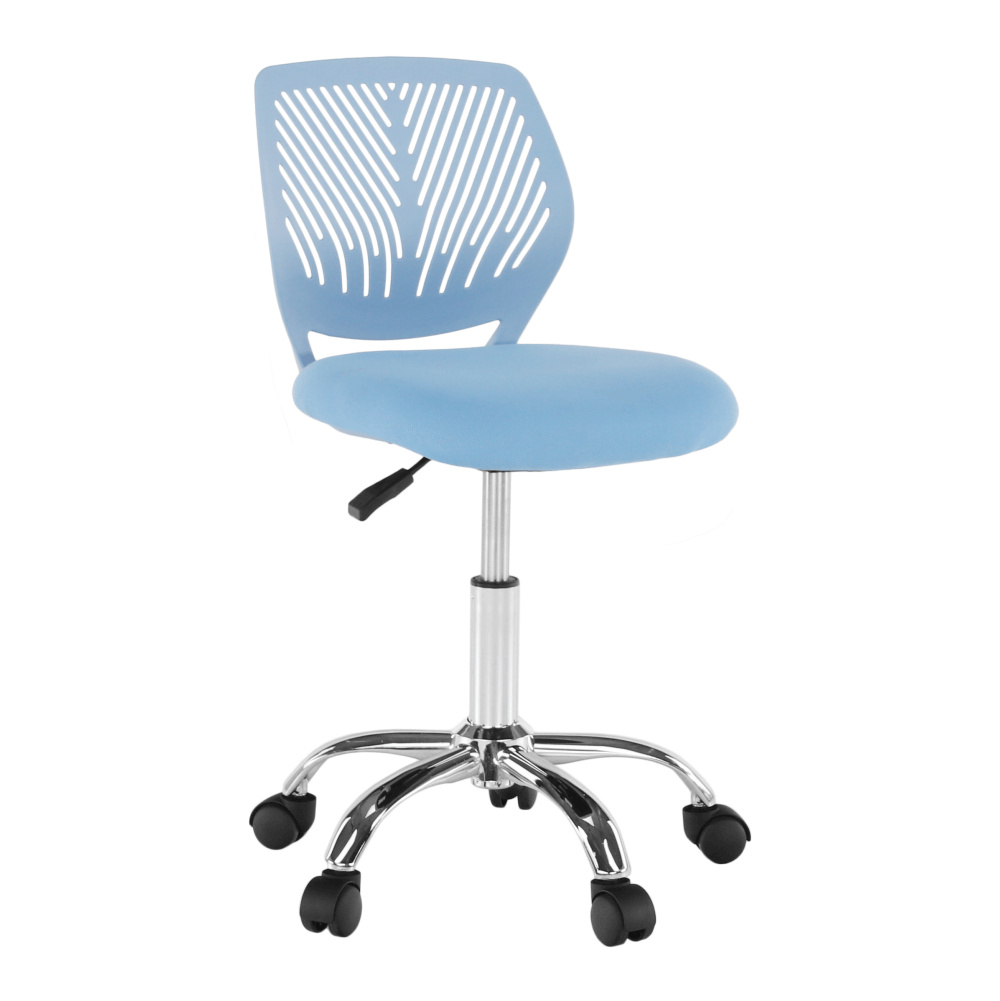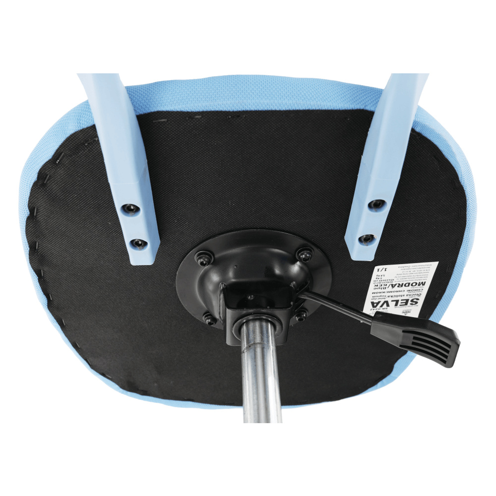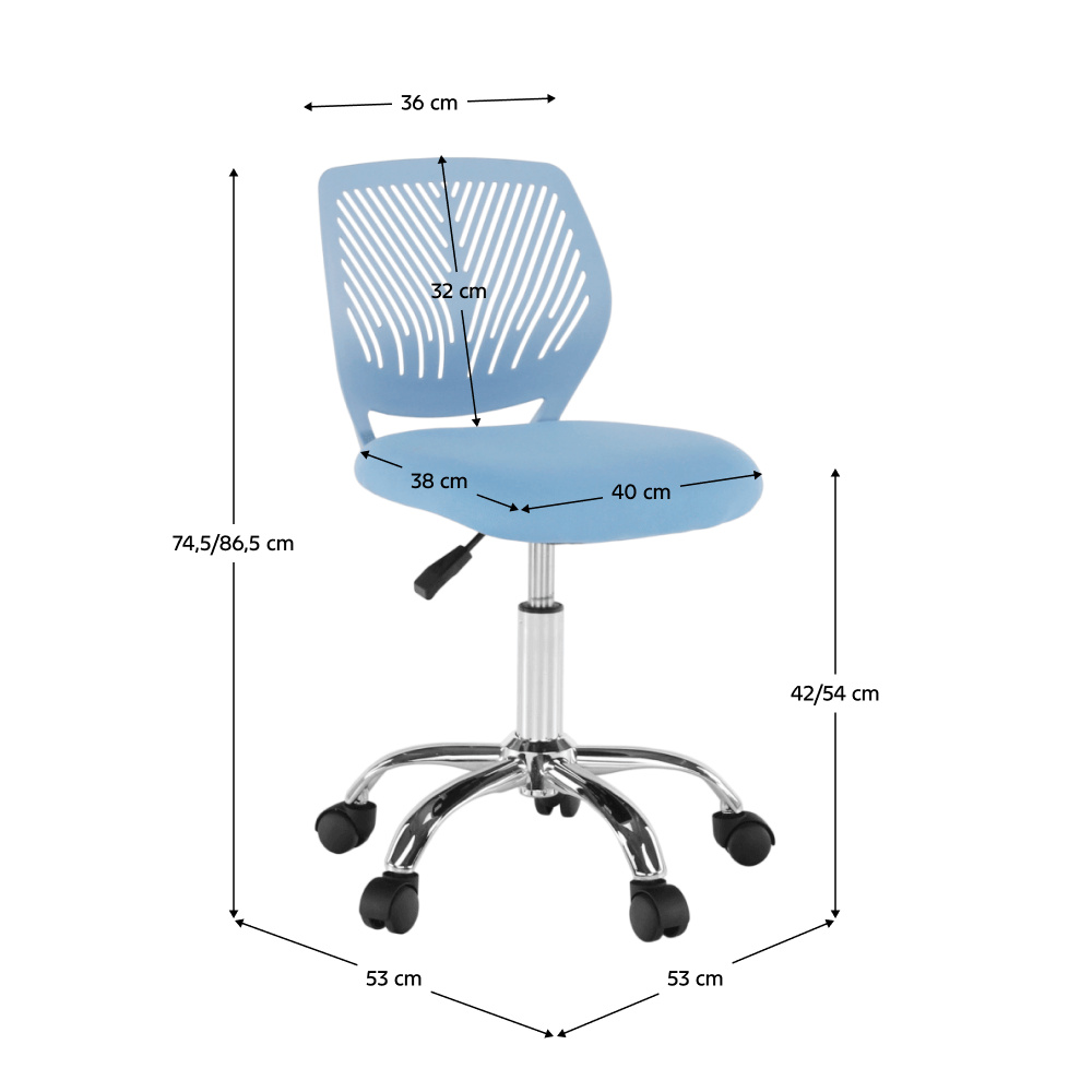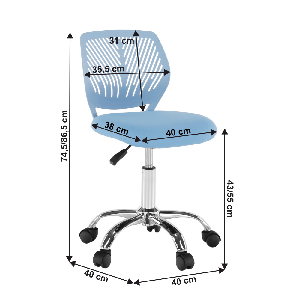 Materiál: polyester / kov Oděruodolnost textilie podle testu Martindale: 100 000 oděrek Barva: modrá / chrom Rozměry (ŠxHxV): 53x53x74,5-86,5 cm Nastavitelná výška sedu: 42-54 cm Hloubka sedu: 38 cm Šířka sedu: 40 cm Výška zádové opěrky: 32 cm Šířka zádové opěrky: 36 cm Nosnost: 80 kg otočná S kolečky perforované opěradlo Dodávané v demontu