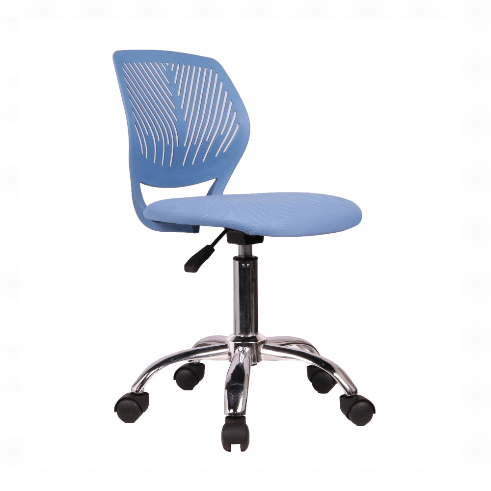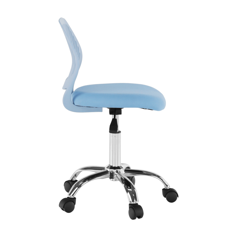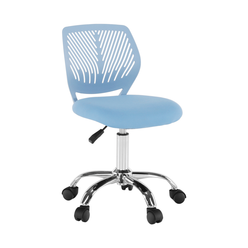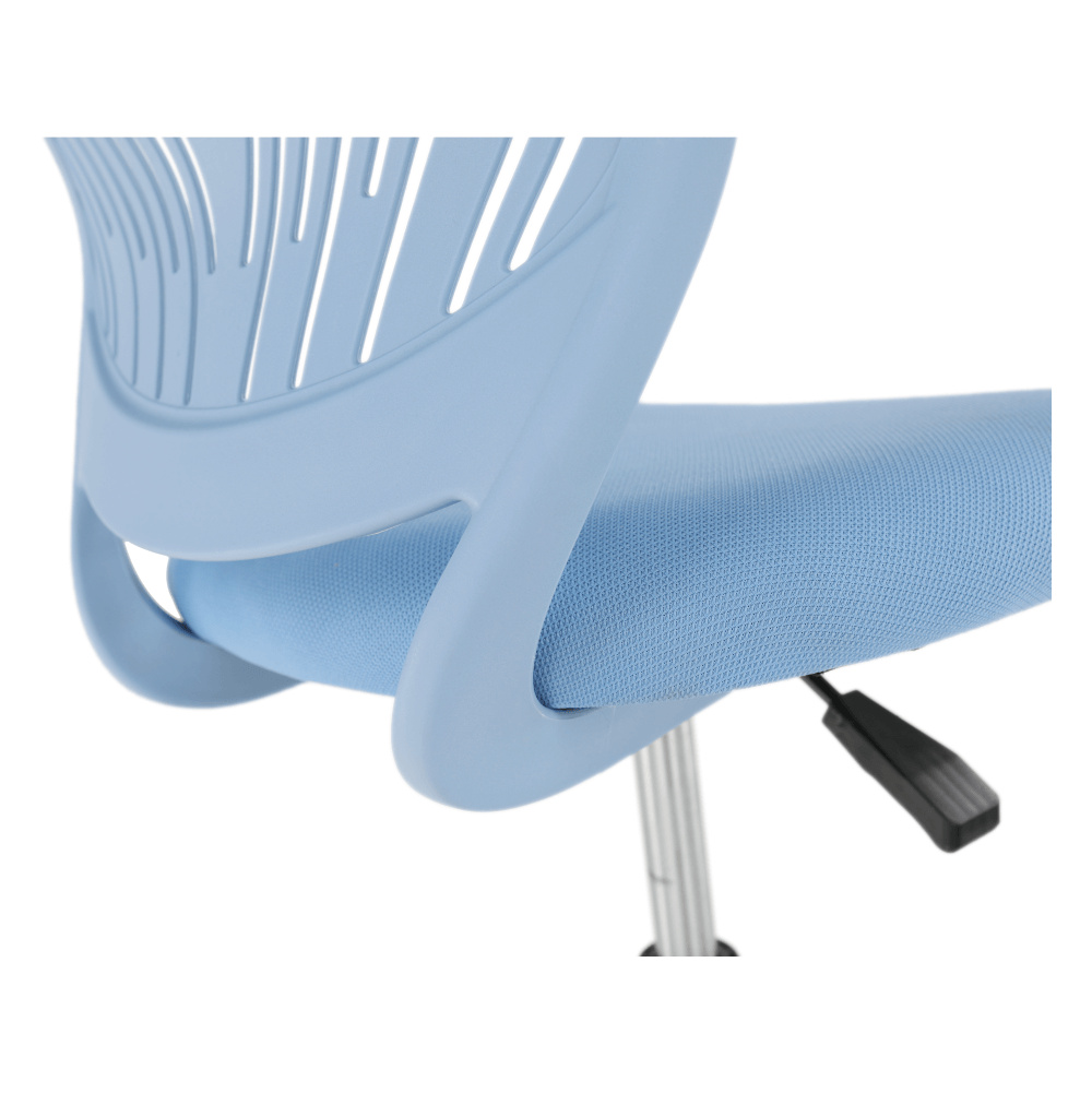 Materiál: polyester / kov Oděruodolnost textilie podle testu Martindale: 100 000 oděrek Barva: modrá / chrom Rozměry (ŠxHxV): 53x53x74,5-86,5 cm Nastavitelná výška sedu: 42-54 cm Hloubka sedu: 38 cm Šířka sedu: 40 cm Výška zádové opěrky: 32 cm Šířka zádové opěrky: 36 cm Nosnost: 80 kg otočná S kolečky perforované opěradlo Dodávané v demontu
