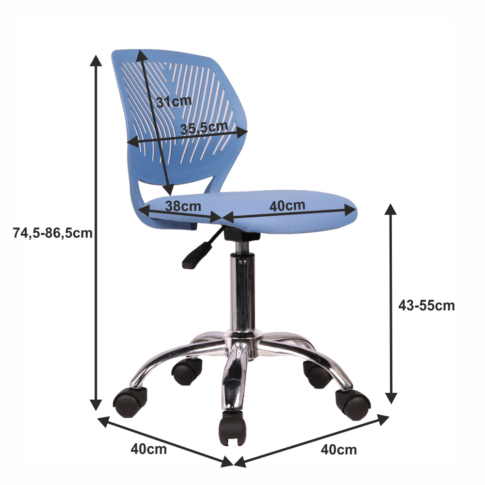 Materiál: síťovina/plast Oděruodolnost síťoviny podle testu Martindale: 90 000 oděrů Barva: modrá/bílá Rozměry (ŠxHxV): 59x50x81-91 cm Výška sedu: 45-55 cm Hloubka sedu: 42 cm Šířka sedu: 43 cm Výška zádové opěrky: 40 cm Šířka zádové opěrky: 43 cm Výška od země po opěrku na ruce: 58-68 cm Nosnost: 90 kg Otočná židle Nastavitelná výška sed
