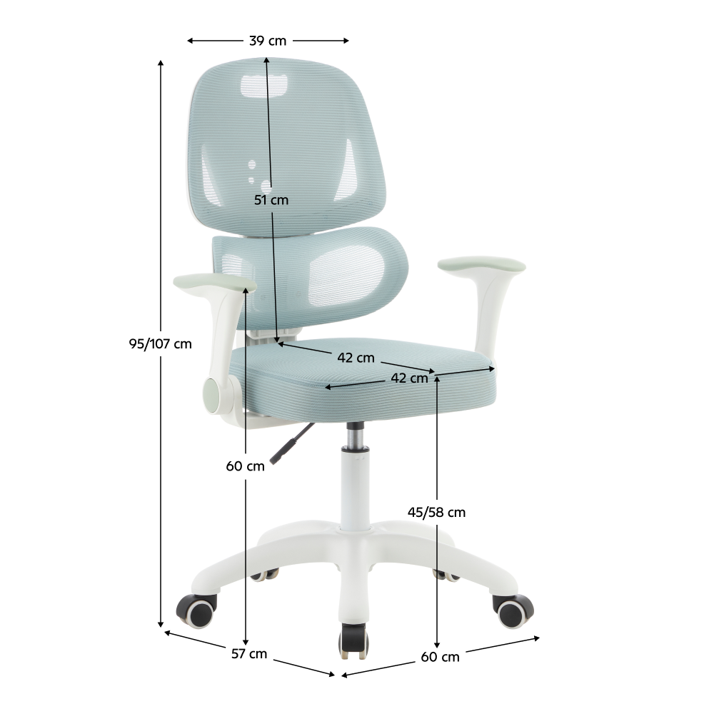 Materiál: síťovina/plast Oděruodolnost síťoviny podle testu Martindale: 90 000 oděrů Barva: neomint/bílá Rozměry (ŠxHxV): 60x57x95-107 cm Výška sedu: 45-58 cm Hloubka sedu: 42 cm Šířka sedu: 42 cm Výška zádové opěrky: 51 cm Šířka zádové opěrky: 39 cm Hmotnost: 8,26 kg Nosnost: 100 kg Otočná židle Ergonomicky tvarovaná bederní část opěrky Nastavitelná výška sedu Nastavitelná výška opěrky zad Sklápěcí opěrky na ruce Univerzální kolečka Kolečka jsou vhodná pro měkké i tvrdé podlahy Praktická Ergonomické vlastnosti Dodáváno v demontu
