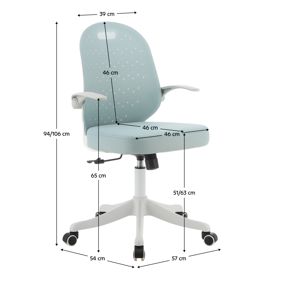 Materiál: síťovina/plast Oděruodolnost síťoviny podle testu Martindale: 90 000 oděrů Barva: neomint/bílá/šedá Rozměry (ŠxHxV): 57x54x94-106 cm Výška sedu: 51-63 cm Hloubka sedu: 46 cm Šířka sedu: 46 cm Výška zádové opěrky: 46 cm Šířka zádové opěrky: 39 cm Hmotnost: 6,75 kg Nosnost: 100 kg Otočná židle Nastavitelná výška sedu Funkce houpání Sklopné opěrky na ruce Univerzální kolečka Kolečka jsou vhodná pro měkké i tvrdé podlahy Praktická Dodáváno v demontu