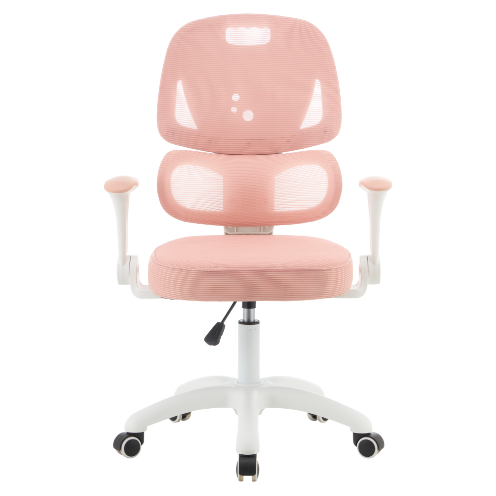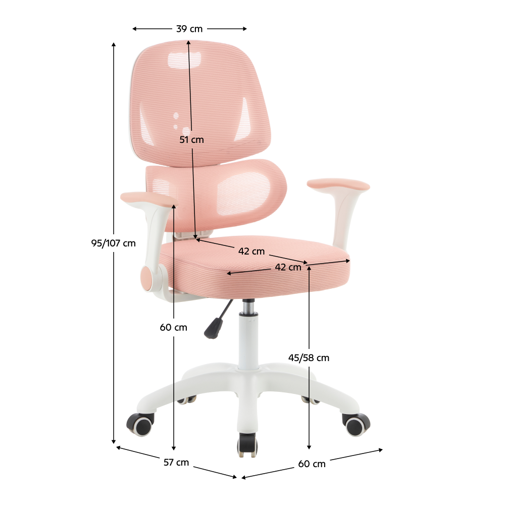 Materiál: síťovina/plast Oděruodolnost síťoviny podle testu Martindale: 90 000 oděrů Barva: růžová/bílá Rozměry (ŠxHxV): 60x57x95-107 cm Výška sedu: 45-58 cm Hloubka sedu: 42 cm Šířka sedu: 42 cm Výška zádové opěrky: 51 cm Šířka zádové opěrky: 39 cm Hmotnost: 8,26 kg Nosnost: 100 kg Otočná židle Ergonomicky tvarovaná bederní část opěrky Nastavitelná výška sedu Nastavitelná výška opěrky zad Sklápěcí opěrky na ruce Univerzální kolečka Kolečka jsou vhodná pro měkké i tvrdé podlahy Praktická Ergonomické vlastnosti Dodáváno v demontu