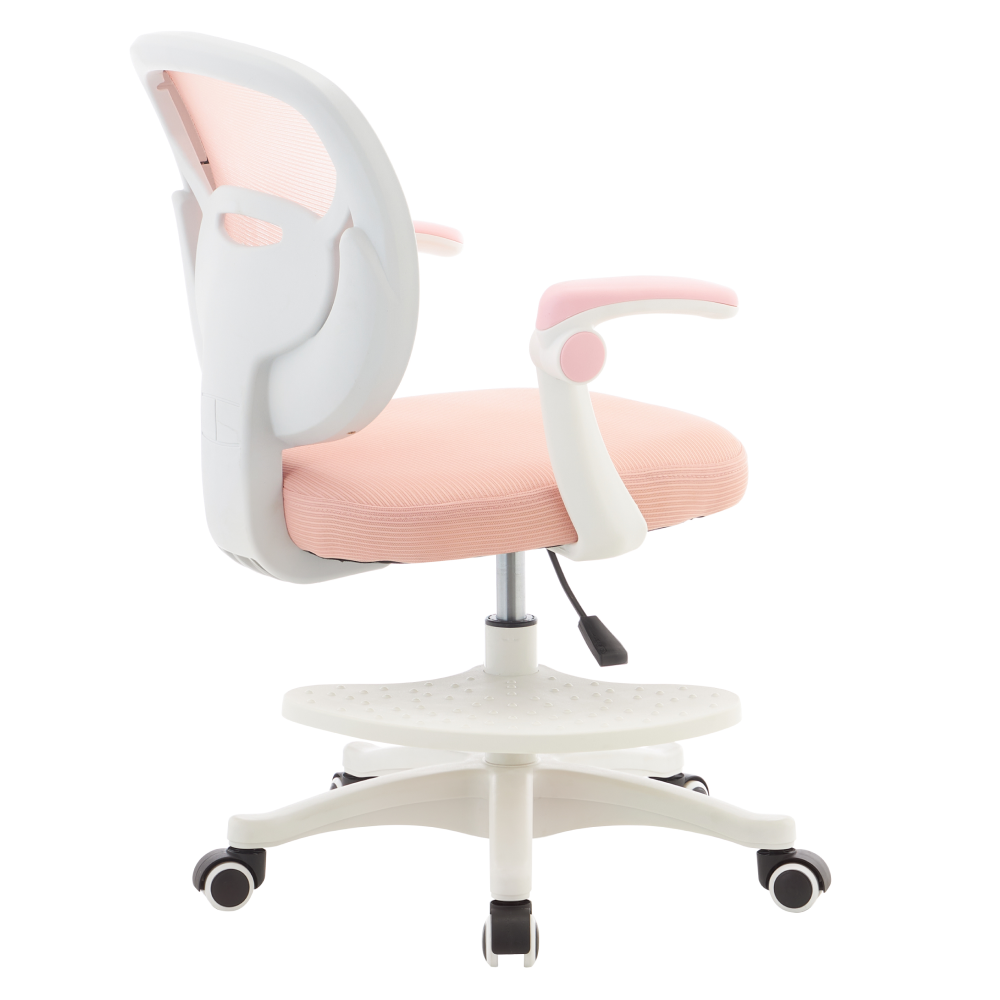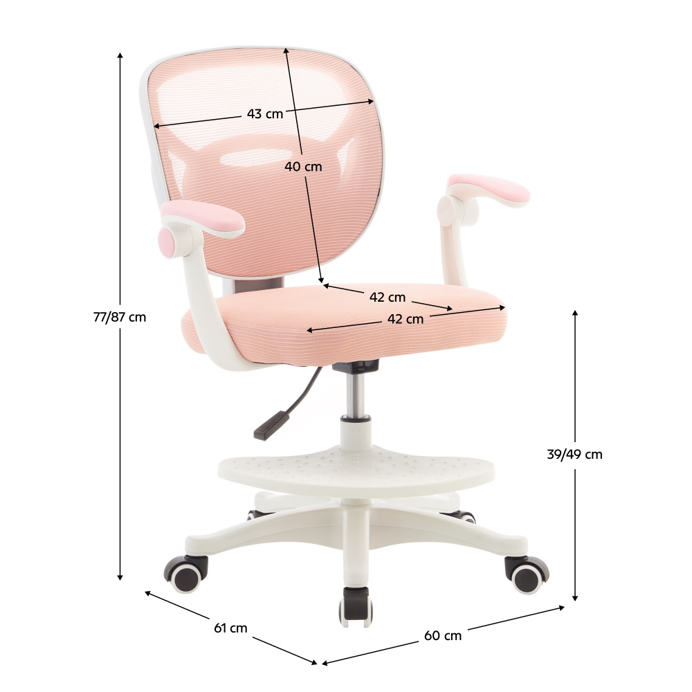 Materiál: síťovina/plast Oděruodolnost síťoviny podle testu Martindale: 90 000 oděrů Barva: růžová/bílá Rozměry (ŠxHxV): 60x61x77-87 cm Výška sedu: 39-49 cm Hloubka sedu: 42 cm Šířka sedu: 42 cm Šířka zádové opěrky: 43 cm Výška zádové opěrky: 40 cm Nosnost: 90 kg Otočná židle Nastavitelná výška sedu Opěrky na ruce s funkcí sklopení Univerzální kolečka Kolečka jsou vhodná pro měkké i tvrdé podlahy Podnož na nohy s nastavitelnou výškou Podnož je odnímatelná Dodáváno v demontu