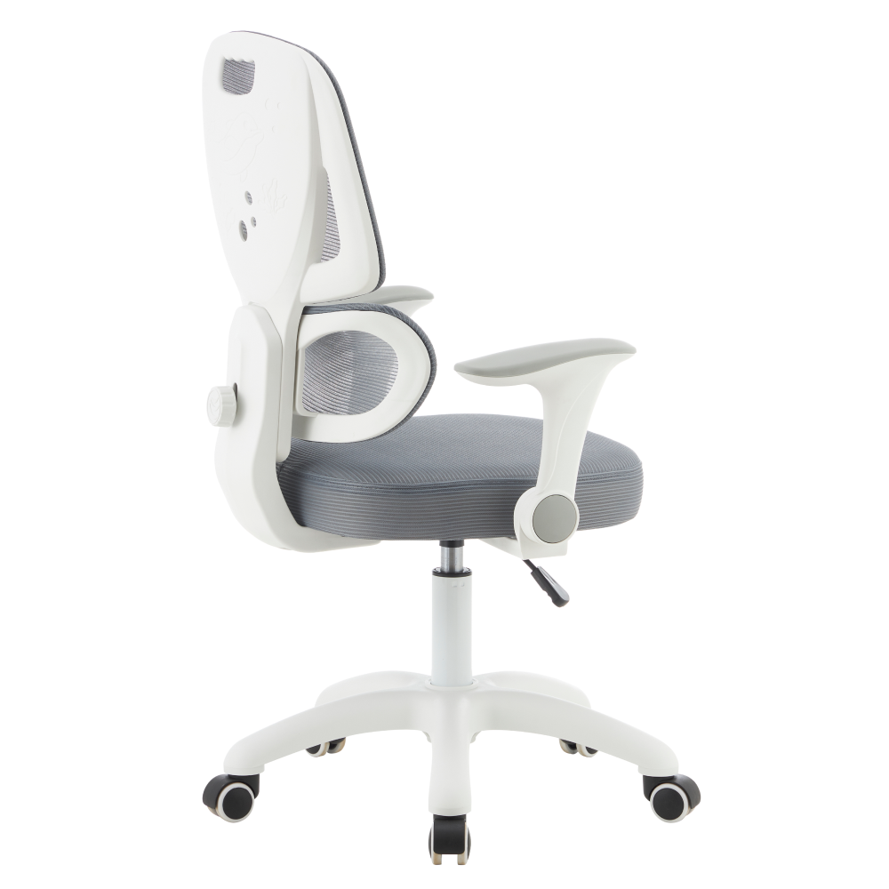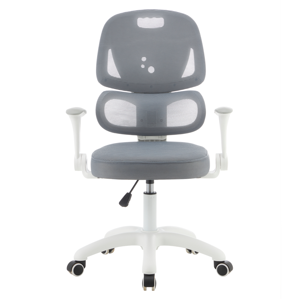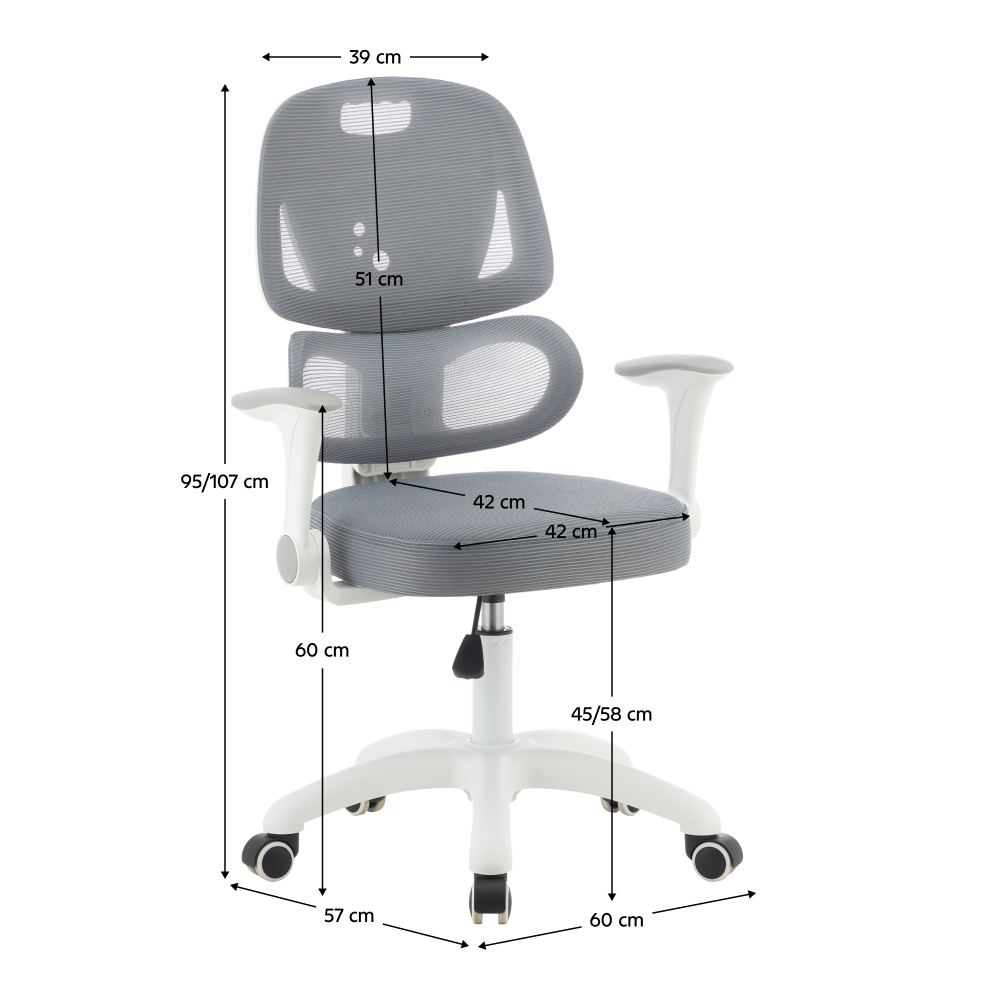 Materiál: síťovina/plast Oděruodolnost síťoviny podle testu Martindale: 90 000 oděrů Barva: šedá/bílá Rozměry (ŠxHxV): 60x57x95-107 cm Výška sedu: 45-58 cm Hloubka sedu: 42 cm Šířka sedu: 42 cm Výška zádové opěrky: 51 cm Šířka zádové opěrky: 39 cm Hmotnost: 8,26 kg Nosnost: 100 kg Otočná židle Ergonomicky tvarovaná bederní část opěrky Nastavitelná výška sedu Nastavitelná výška opěrky zad Sklopné opěrky na ruce Univerzální kolečka Kolečka jsou vhodná pro měkké i tvrdé podlahy Praktická Ergonomické vlastnosti Dodáváno v demontu