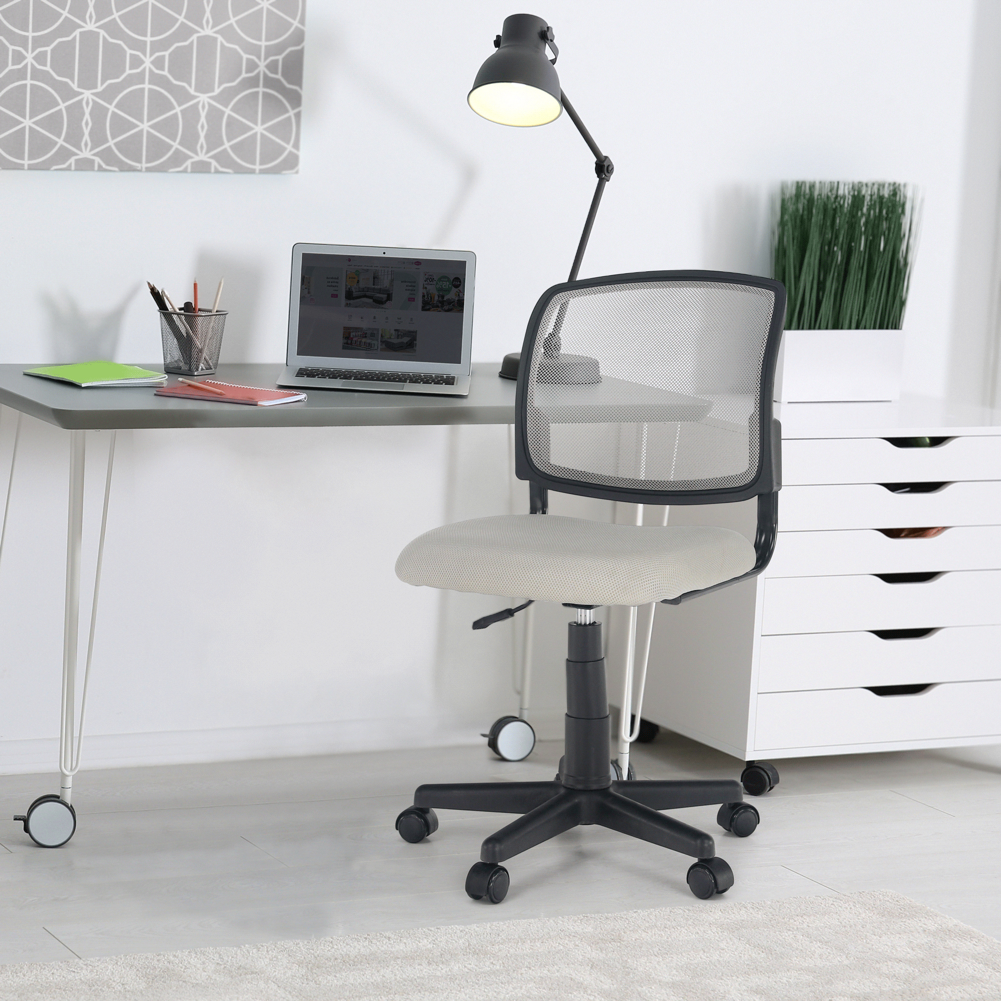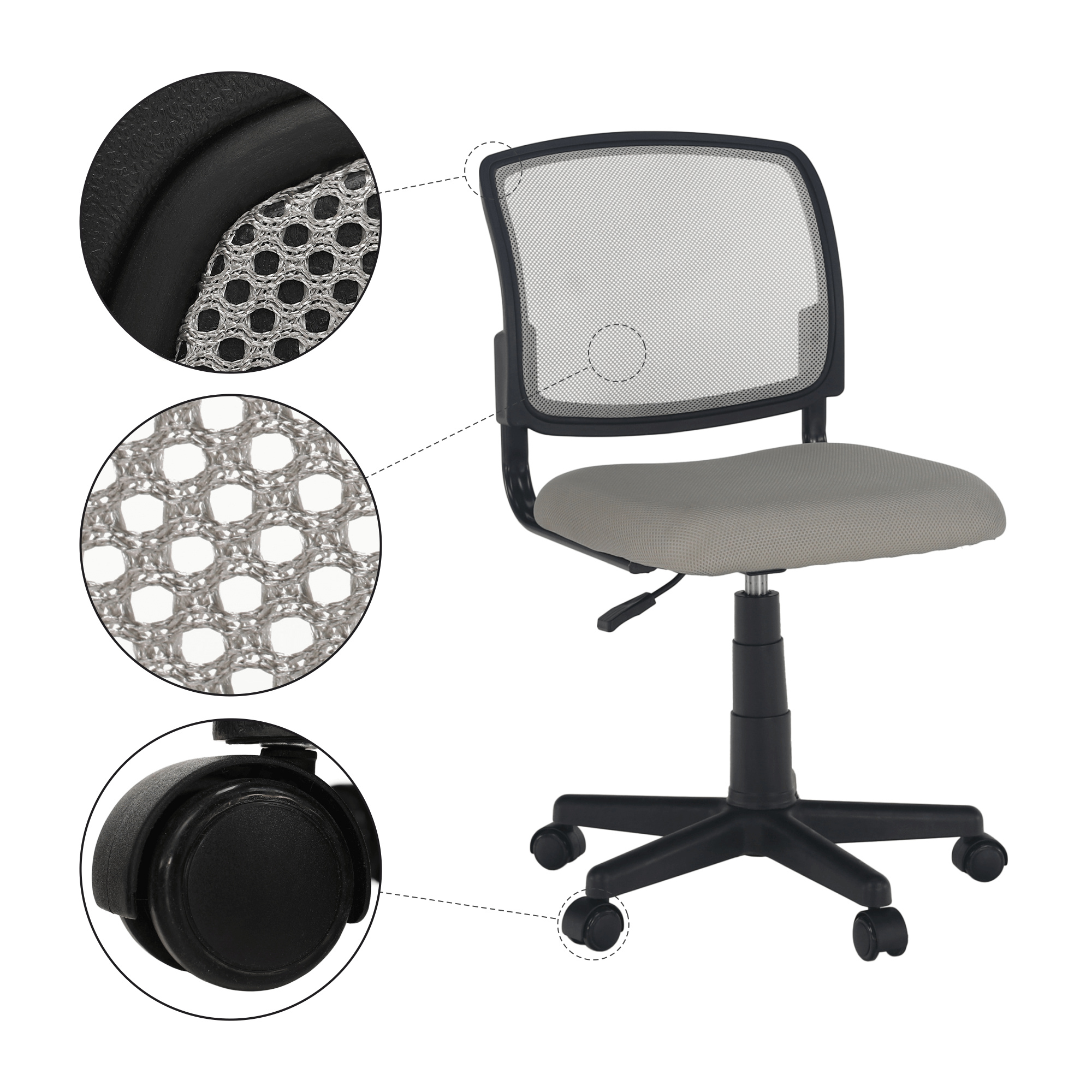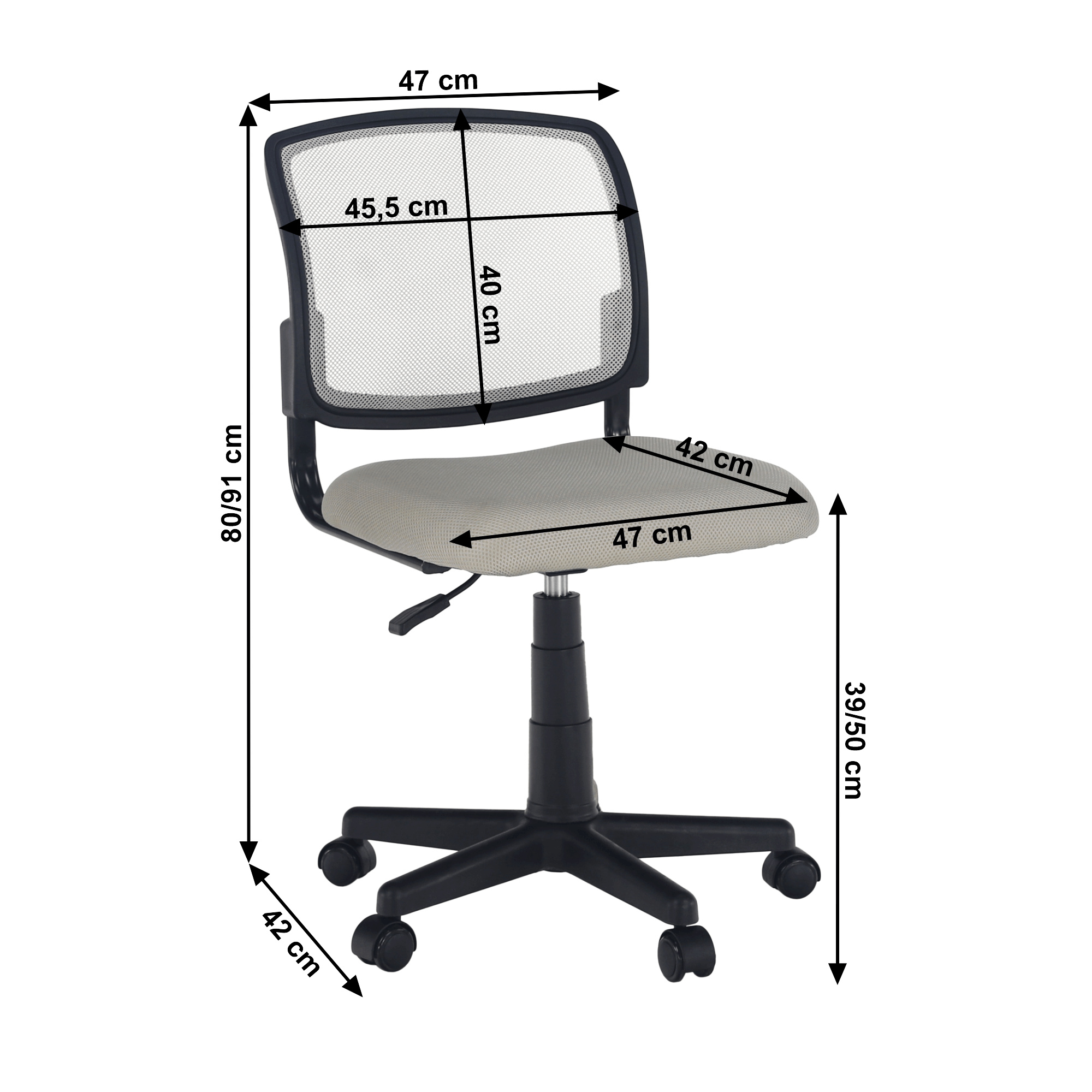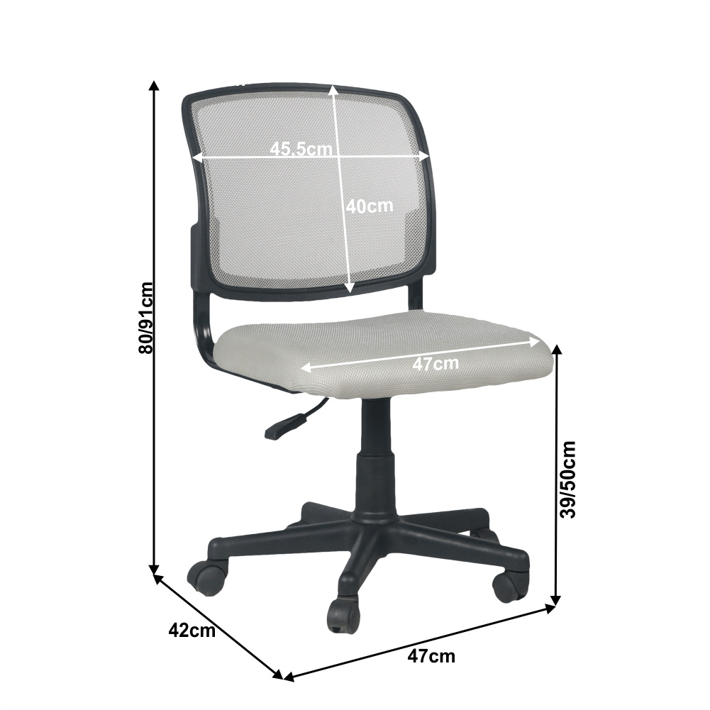 Materiál čalounění: síťovina Oděruodolnost textilie podle testu Martindale: 90 000 oděrek Barva čalounění: šedá Materiál podstava: plast Barva podstava: černá Rozměry (ŠxHxV): 47x42x80 / 91 cm Nastavitelná výška sedu: 39-50 cm Hloubka sedu: 42 cm Šířka sedu: 47 cm Výška zádové opěrky: 40 cm Šířka zádové opěrky: 45,5 cm Nosnost: 90 kg otočná S kolečky Dodávané v demontu
