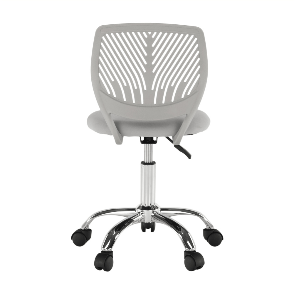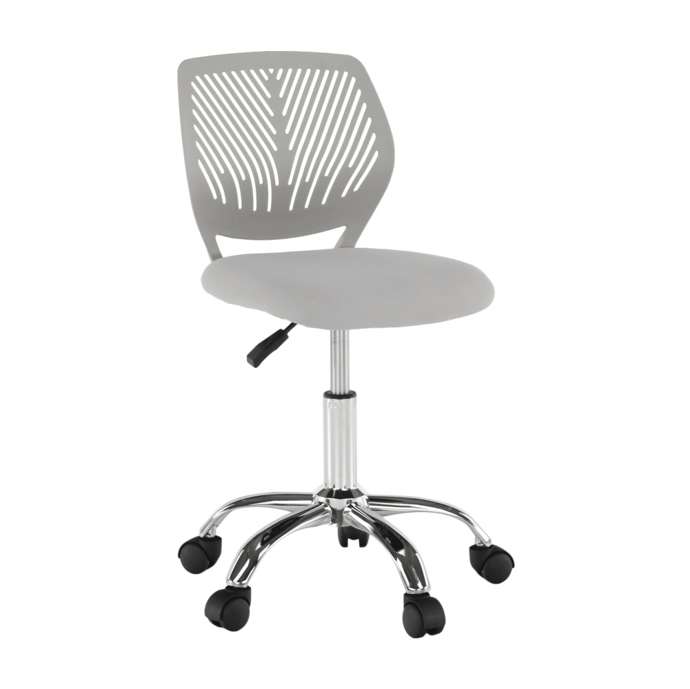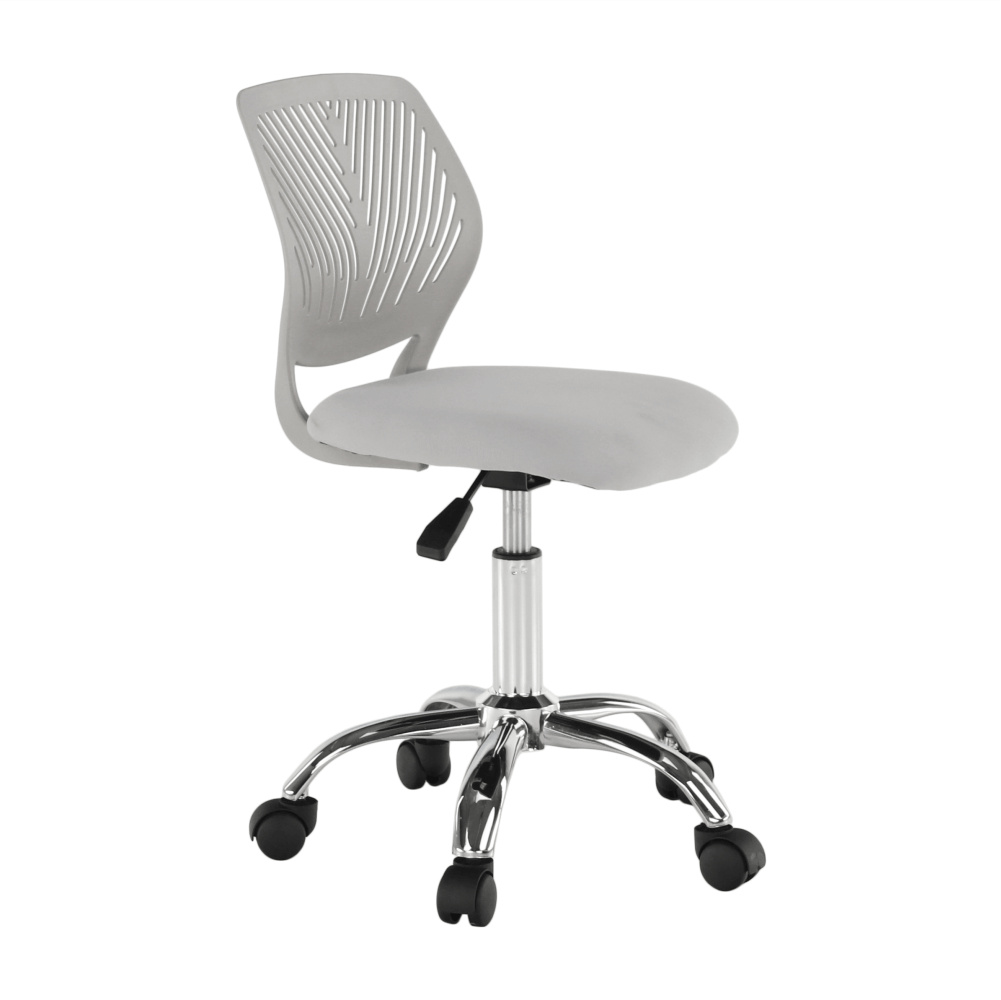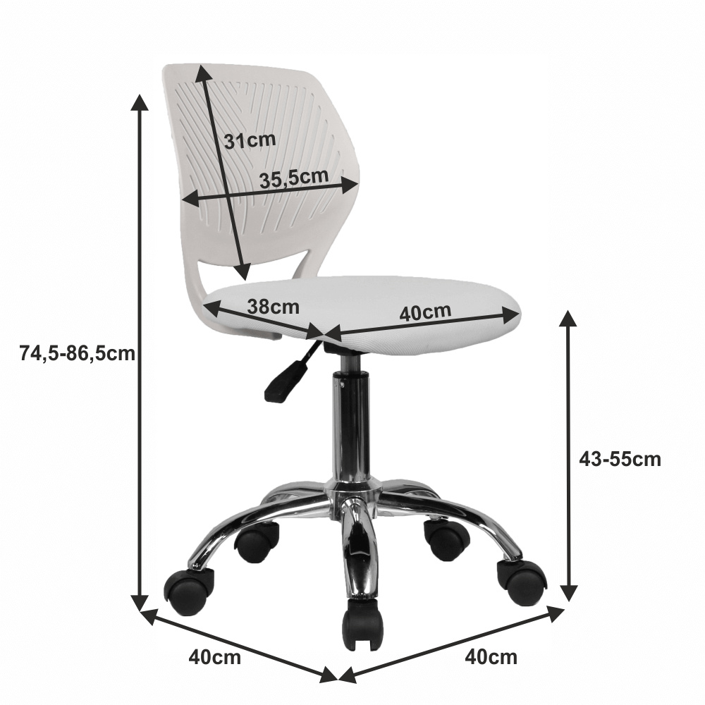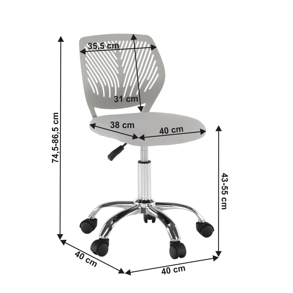 Materiál: polyester / kov Oděruodolnost textilie podle testu Martindale: 100 000 oděrek Barva: šedá / chrom Rozměry (ŠxHxV): 53x53x74,5-86,5 cm Nastavitelná výška sedu: 42-54 cm Hloubka sedu: 38 cm Šířka sedu: 40 cm Výška zádové opěrky: 32 cm Šířka zádové opěrky: 36 cm Nosnost: 80 kg otočná S kolečky perforované opěradlo Dodávané v demontu