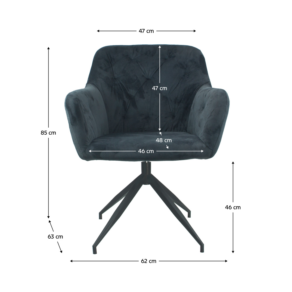 Materiál čalounění: Velvet látka Oděruodolnost textilie podle testu Martindale: 85 000 oděrek Barva: tmavě šedá Materiál nohy: kov Barva: černá Rozměry (ŠxHxV): 66x66x83 cm Výška sedu : 78 cm Hloubka sedu: 43,5 cm Šířka sedu: 42 cm Výška zádové opěrky: 40 cm Šířka zádové opěrky: 52 cm Výška od zeme po opierku na ruky: 72cm Maximální nosnost: 100 kg Hmotnost: 13 kg Prošívaná S dekorativními knoflíky Otočné sedátko Vhodné i do domácích kanceláří Vhodné do jídelny Dodáváno v demontu