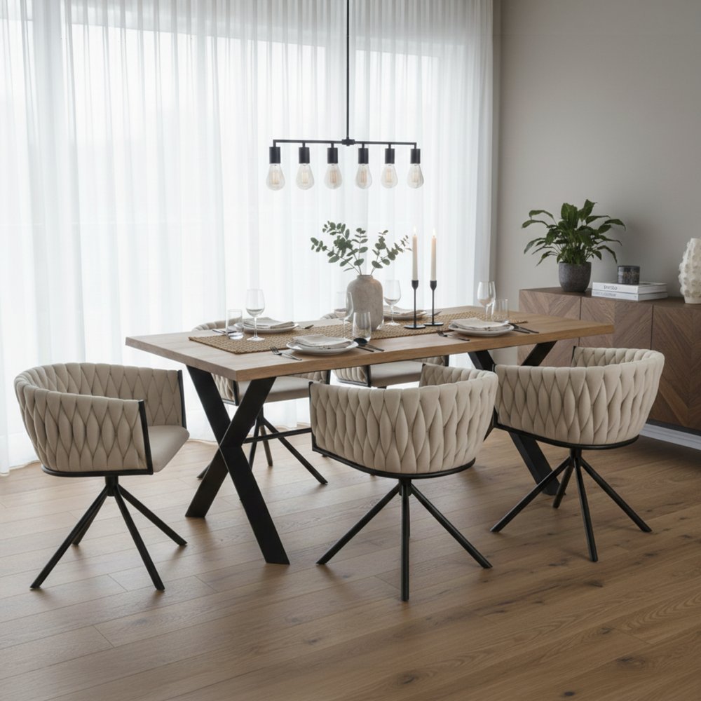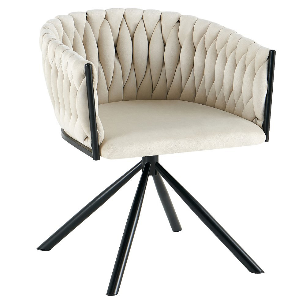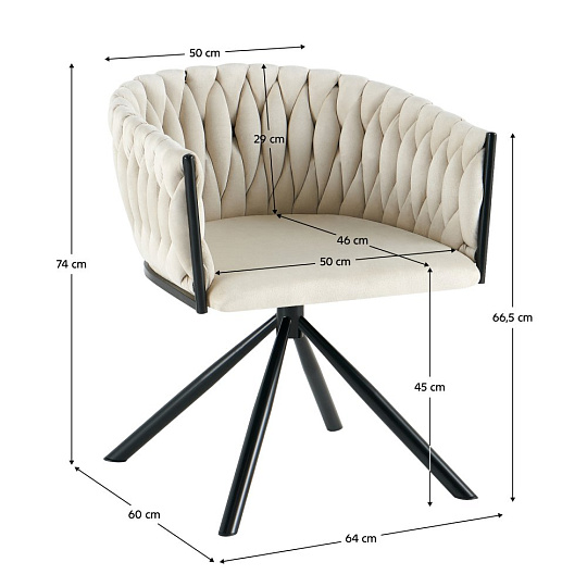 Materiál: látka Velvet/kov Oděruodolnost textilie podle testu Martindale: 80 000 oděrů Barva: béžová/černá Rozměry (ŠxHxV): 64x60x74 cm Výška sedu: 45 cm Hloubka sedu: 46 cm Šířka sedu: 50 cm Šířka zádové opěrky: 50 cm Výška zádové opěrky: 29 cm Nosnost: 100 kg Kovová konstrukce Opěrky na ruce Designové Otočné Netradiční proplétání Dodáváno v demontu