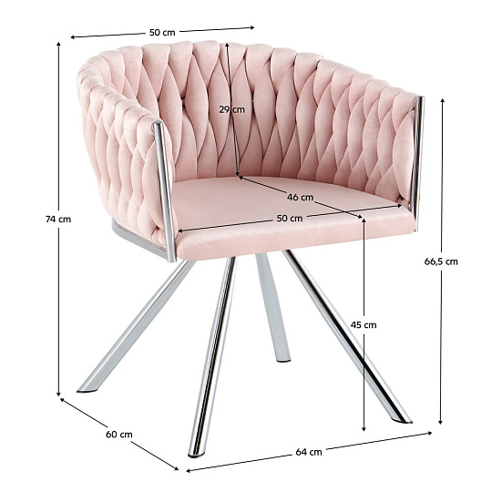 Materiál: látka Velvet/kov Oděruodolnost textilie podle testu Martindale: 80 000 oděrů Barva: pudrově růžová/chrom Rozměry (ŠxHxV): 64x60x74 cm Výška sedu: 45 cm Hloubka sedu: 46 cm Šířka sedu: 50 cm Šířka zádové opěrky: 50 cm Výška zádové opěrky: 29 cm Nosnost: 100 kg Kovová konstrukce Opěrky na ruce Designové Otočné Netradiční proplétání Dodáváno v demontu