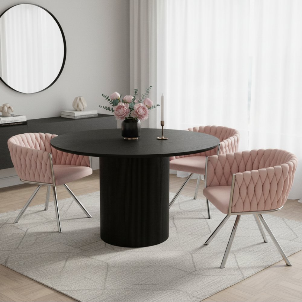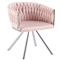 Materiál: látka Velvet/kov Oděruodolnost textilie podle testu Martindale: 80 000 oděrů Barva: pudrově růžová/chrom Rozměry (ŠxHxV): 64x60x74 cm Výška sedu: 45 cm Hloubka sedu: 46 cm Šířka sedu: 50 cm Šířka zádové opěrky: 50 cm Výška zádové opěrky: 29 cm Nosnost: 100 kg Kovová konstrukce Opěrky na ruce Designové Otočné Netradiční proplétání Dodáváno v demontu
