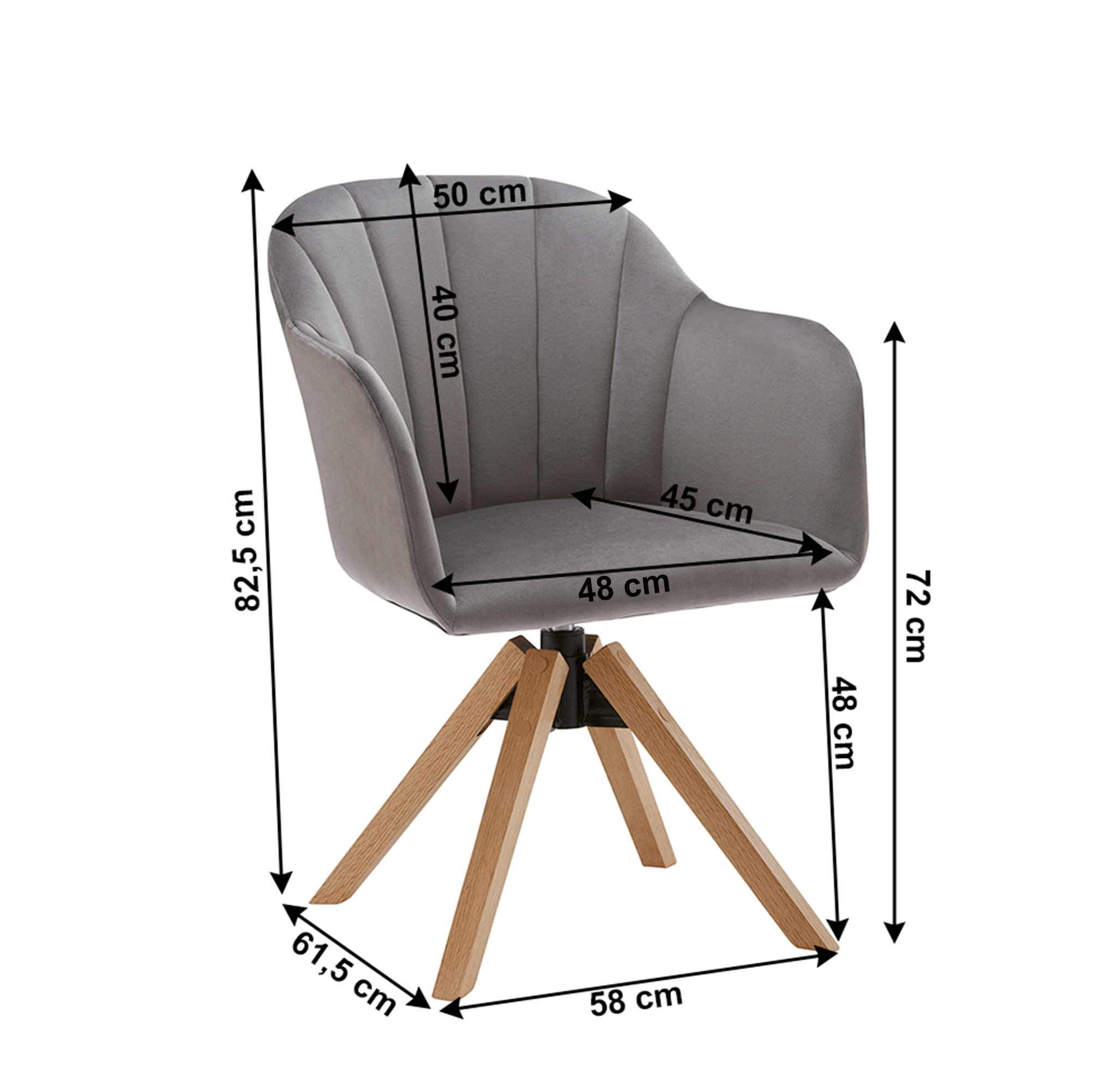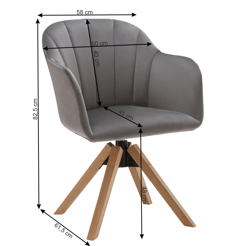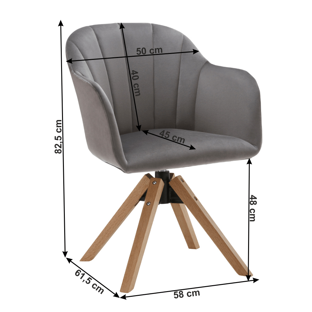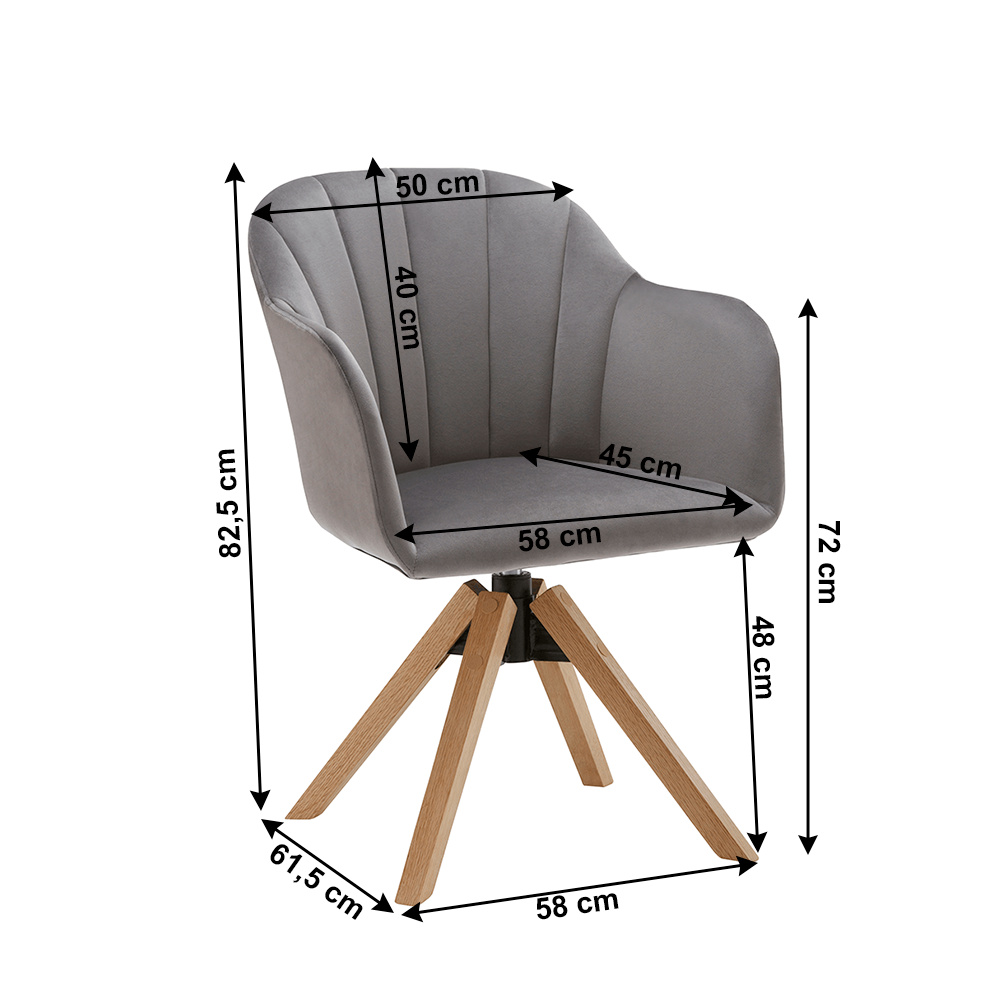 Materiál: látka / masivní dřevo Oděruodolnost textilie podle testu Martindale: 85 000 oděrek Barva: světlešedá / buk Rozměry (ŠxHxV): 58x61,5x82,5 cm Výška sedu: 48 cm Hloubka sedu: 45 cm Šířka sedu: 48 cm Výška zádové opěrky: 40 cm Šířka zádové opěrky: 50 cm Výška od země po opěrku na ruce: 72 cm Maximální nosnost: 110 kg otočné sedadlo Dodávané v demontu.