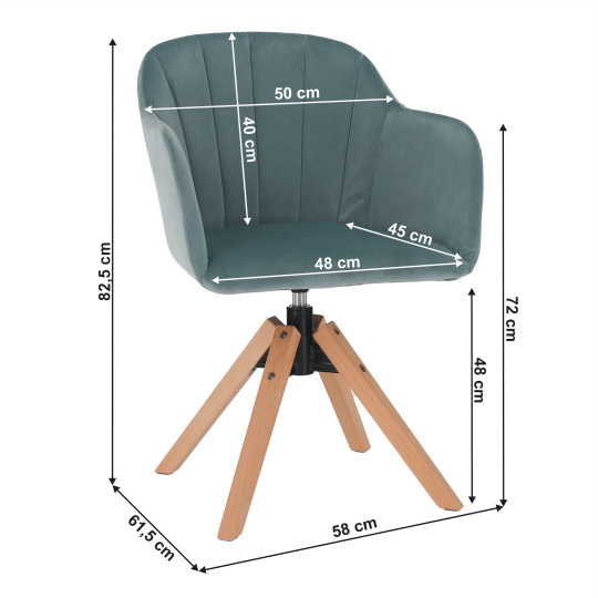 Materiál: látka Velvet / masivní dřevo Oděruodolnost textilie podle testu Martindale: 85 000 oděrek Barva: neomint / buk Rozměry (ŠxHxV): 58x61,5x82,5 cm Výška sedu: 48 cm Hloubka sedu: 45 cm Šířka sedu: 48 cm Výška zádové opěrky: 40 cm Šířka zádové opěrky: 50 cm Výška od země po opěrku na ruce: 72 cm Maximální nosnost: 110 kg otočné sedadlo Dodávané v demontu.