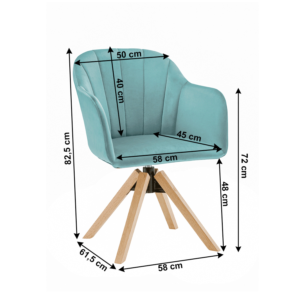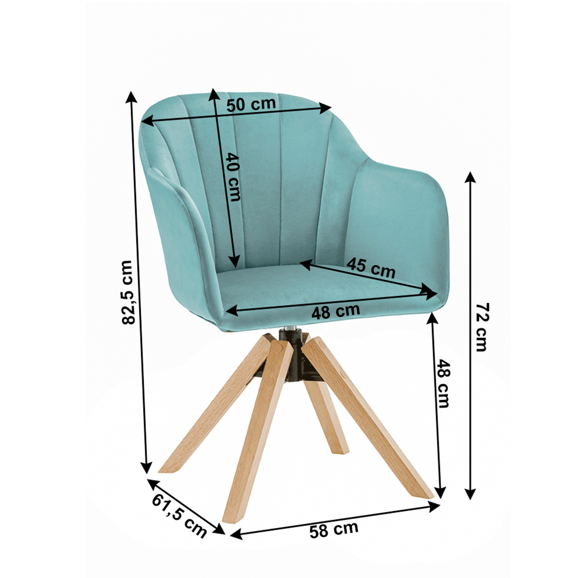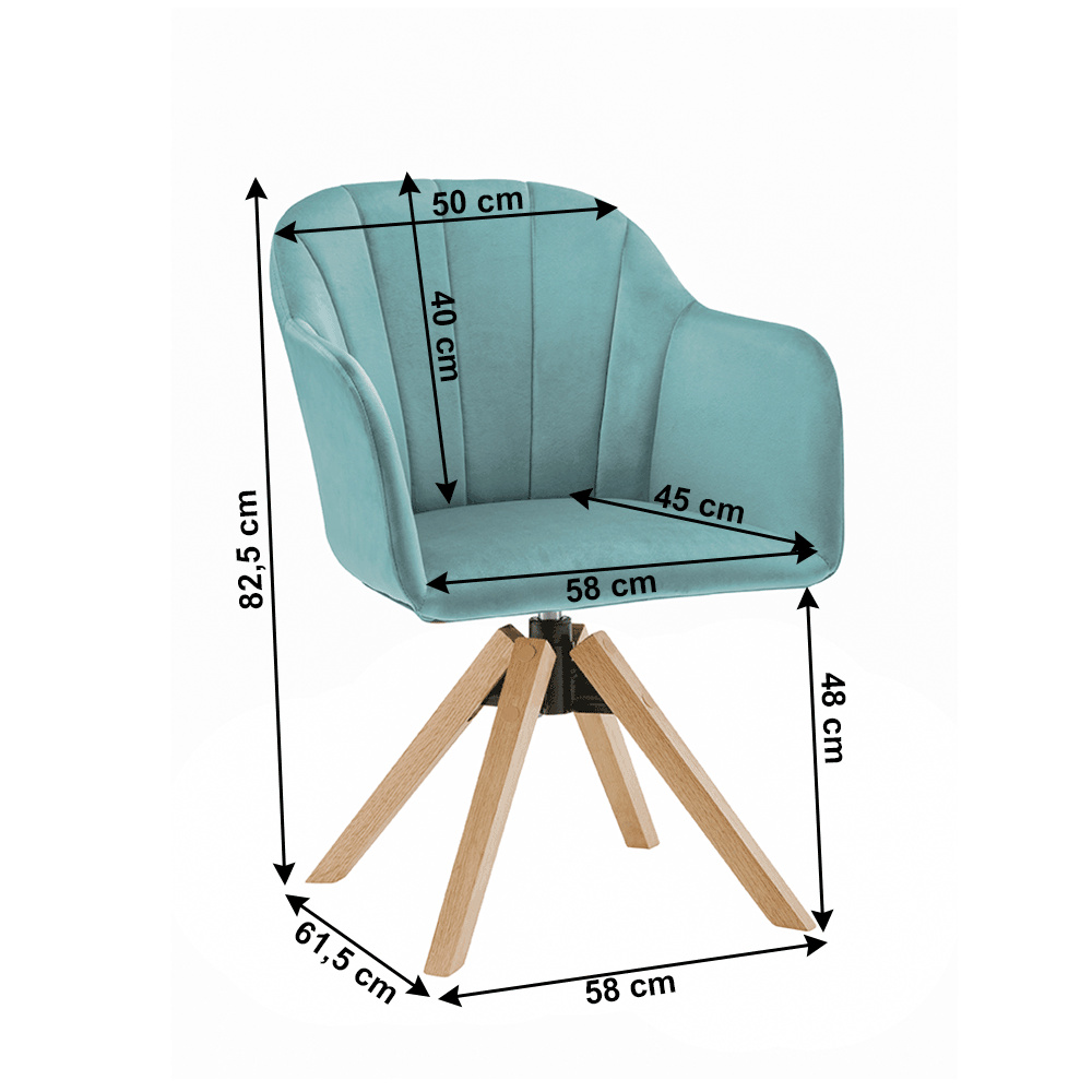 Materiál: látka Velvet / masivní dřevo Oděruodolnost textilie podle testu Martindale: 85 000 oděrek Barva: neomint / buk Rozměry (ŠxHxV): 58x61,5x82,5 cm Výška sedu: 48 cm Hloubka sedu: 45 cm Šířka sedu: 48 cm Výška zádové opěrky: 40 cm Šířka zádové opěrky: 50 cm Výška od země po opěrku na ruce: 72 cm Maximální nosnost: 110 kg otočné sedadlo Dodávané v demontu.