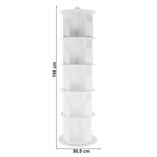 Materiál konstrukce: MDF Barva: bílá Rozměry (ŠxHxV): 45,5x45,5x158 cm knihovna Víceúčelový regál 5-policový Nosnost police: 5 kg Výška mezi police: 30,5 cm Otočný o 360 ° Patra se otáčejí najednou jedním směrem jednoduchá montáž Montáž způsobem "skládačka" Na knihy, dokumenty Na hračky, různé kreativní pomůcky a potřeby Na fotografie, dekorace Jeden pár rukavic grátis Dřevěný stojan na mobil grátis Dodávané v demontu