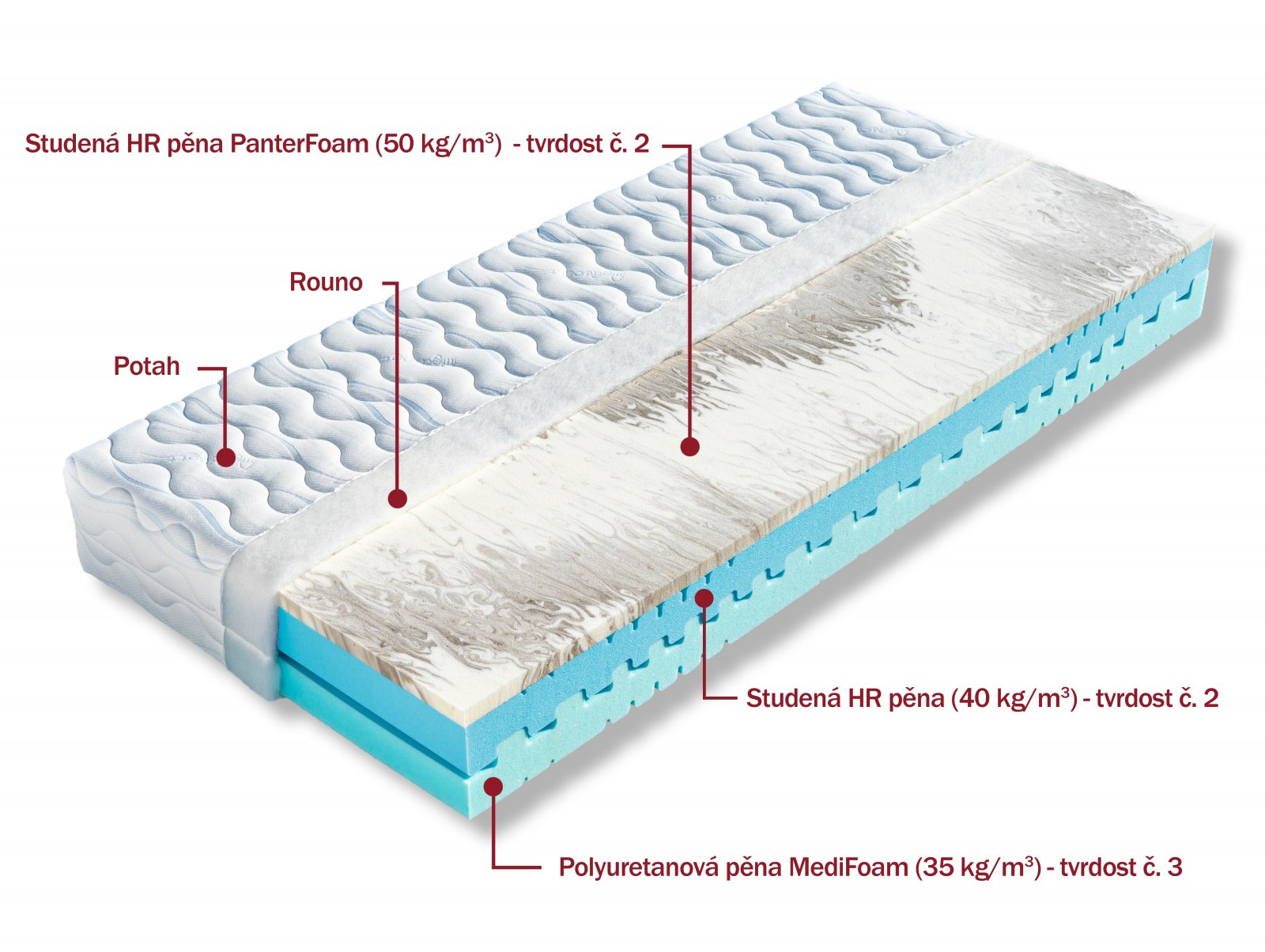 Pohodlná matrace s volbou dvojí tvrdosti se speciální pěnou PanterFoam (50 kg/m³), která je výjimečně elastická, prodyšná, rychle odvětrává absorbovanou vlhkost a má dlouhou životnost. Dobrá ventilace zajistí pocit čistoty a svěžesti. Jádro matrace tvoří odolná pěna MediFoam (35 kg/m³) a HR pěna (40 kg/m³) se skvělými ortopedickými vlastnostmi.