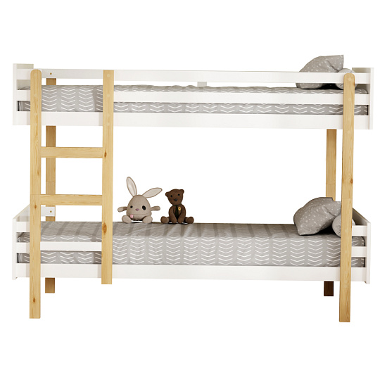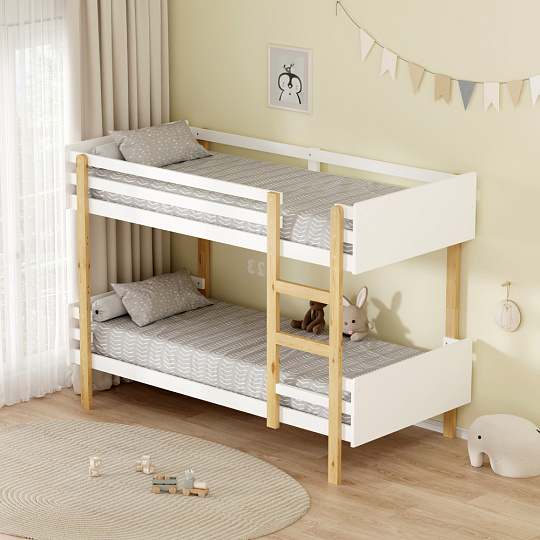 Materiál: borové dřevo/překližka Barva: bílá/dub Rozměry (ŠxHxV): 96x204x144cm Plocha na spaní (ŠxD): 90x200 cm Výška mezi spodním a horním lůžkem: 80 cm Nosnost na lůžko: 90 kg Na nožičkách S bezpečnostní bariérou Dodáváno s žebříkem Možnost namontovat zábranu a žebřík na levou nebo pravou stranu Dodávána bez matrace Možnost zakoupit matraci z naší nabídky Doporučená minimální výška matrace: 7 cm Zapuštění matrace: 3 cm Dodávána s překližkovými rošty Použité barvy a laky splňují všechny stanovené normy a nezávadnosti Dodáváno v demontu Doporučení pro údržbu: - ošetřujte vlhčeným hadříkem - používejte pouze mýdlo PH neutrální - nevystavujte přímému slunečnímu záření